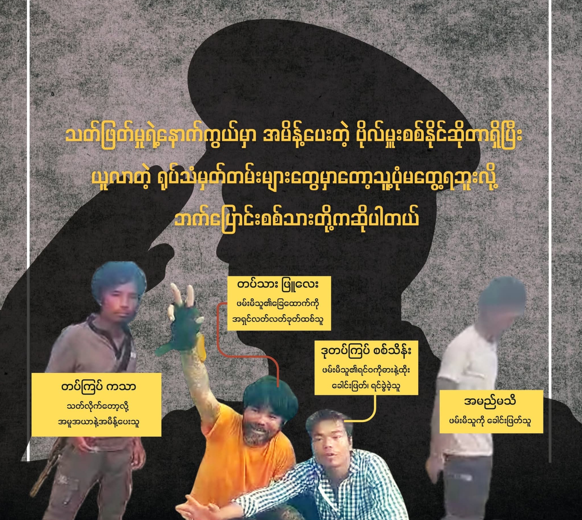 သေနတ်စလွယ်သိုင်းကာ စစ်ဆေးမေးမြန်းပြီးနောက် သတ်ဖြတ်ရန် အမိန့်ပေးနေသူမှာ ဒုတပ်ကြပ် ကသာ ဆိုသူ ဖြစ်သည်၊ ဓားနှင့်ထိုး၊ ကိုယ်လက်အင်္ဂါများ ခုတ်ဖြတ်ရာတွင် ပါဝင်သည့် ရှပ်အင်္ကျီအကွက် လက်ရှည် နှင့်ပုဆိုးအစိမ်း ဝတ်ထားသူမှာ ဒုတပ်ကြပ် စစ်သိန်း၊ တီရှပ်လိမ္မော်ရောင်ဝတ်ထားပြီး တက်တက်ကြွကြွ ခုတ်ထစ်နေသူမှာ တပ်သား ဖြူလေး ဖြစ်ကြောင်း သိရသည်။