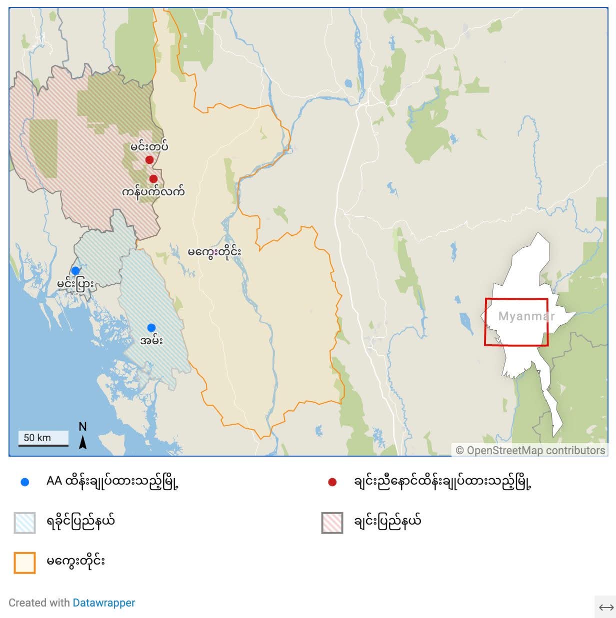 အနောက်ပိုင်းတိုင်းစစ်ဌာနချုပ်အခြေစိုက်ရာ အမ်းမြို့ကို AA က ဒီဇင်ဘာလအတွင်း သိမ်းပိုက်လိုက်သလို ချင်းပြည်တောင်ပိုင်း မင်းတပ်၊ ကန်ပက်လက်မြို့တို့ကို ချင်းညီနောင်အဖွဲ့က ပြီးခဲ့သည့်ရက်ပိုင်းက ထိန်းချုပ်လိုက်ရာ မကွေးတိုင်းအနောက်မြောက်ဘက်ခြမ်း နယ်စပ်တလျှောက်မှာ တော်လှန်ရေးအင်အားစု၏ ထိန်းချုပ်မှုအောက်သို့ ကျရောက်သွားပြီဖြစ်သည်။