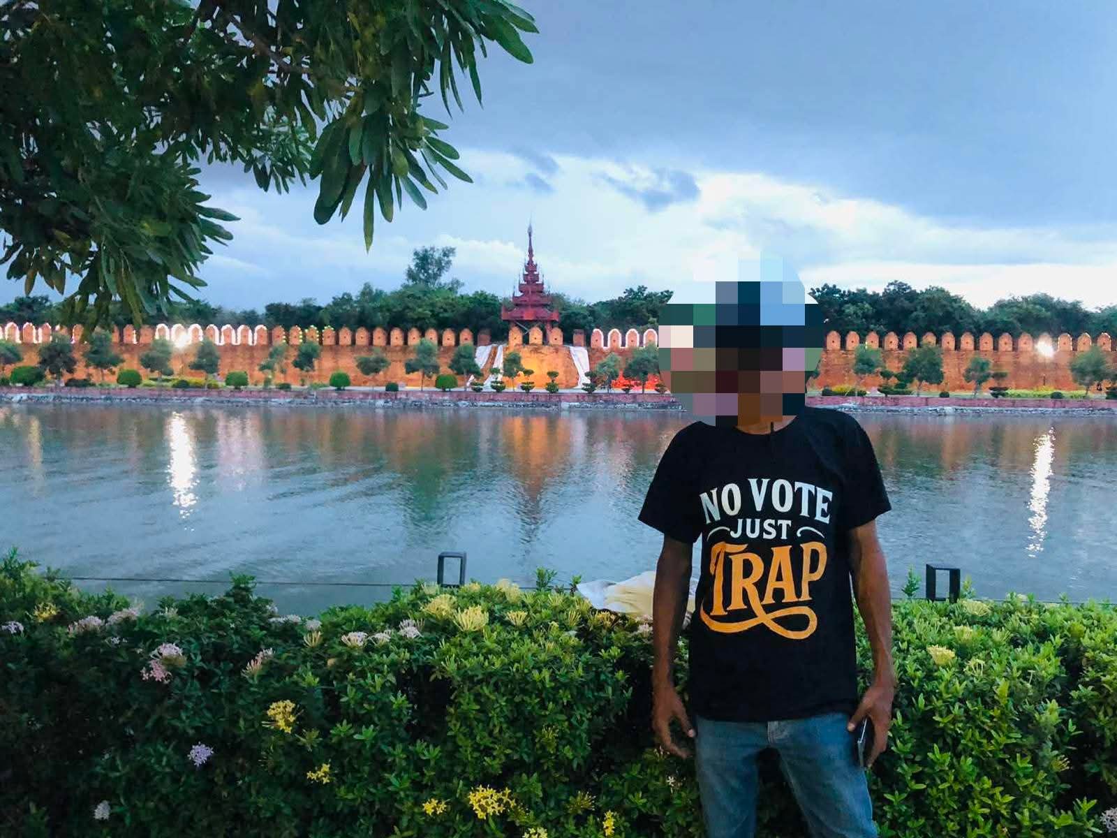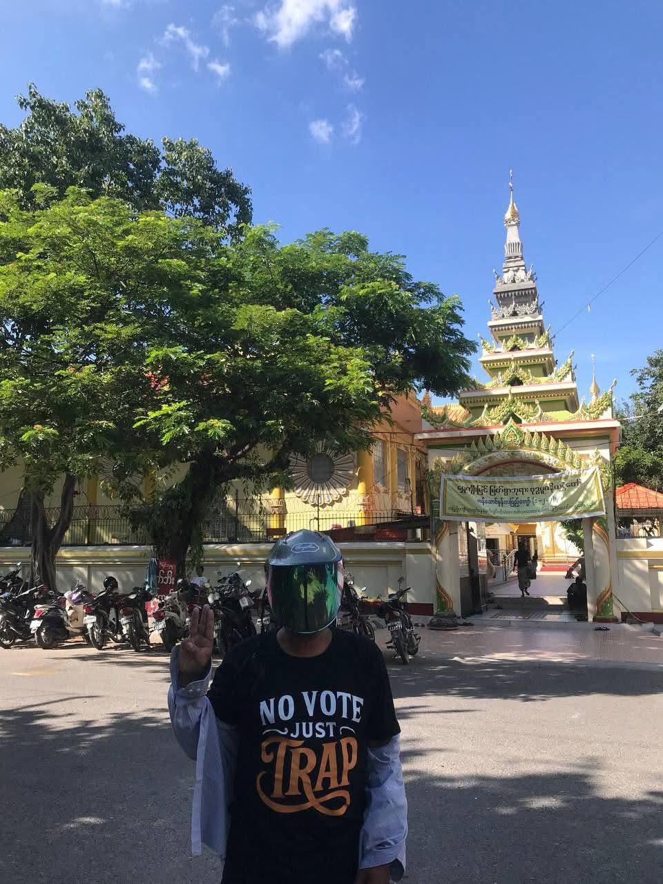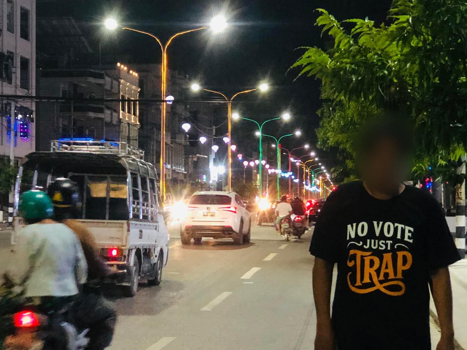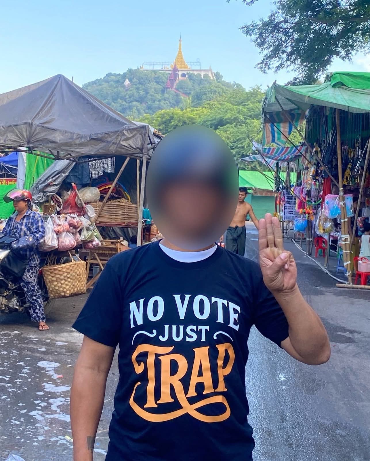 No Vote Just Trap “မဲမပေးနဲ့ ထောင်ချောက်” စာတန်းပါ အင်္ကျီကိုဝတ်ဆင်ပြီး မန္တလေးရဲ့ အထင်ကရ နေရာတွေမှာ လက်သုံးချောင်းထောင် ဆန္ဒထုတ်ဖော်ခဲ့ကြတာဖြစ်ပါတယ်။