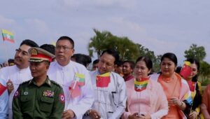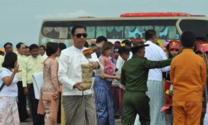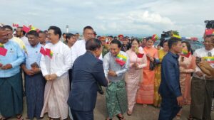 ဓာတ်ပုံ- ၂၀၂၀၄ ခုနှစ် နှစ်ကုန်ပိုင်း ပြည်ပမှ ပြန်လည်ရောက်ရှိလာမည့် မင်းအောင်လှိုင်ကို ကြိုဆိုနေသည့် စစ်တပ်ထောက်ခံသော အနုပညာရှင်တချို့။