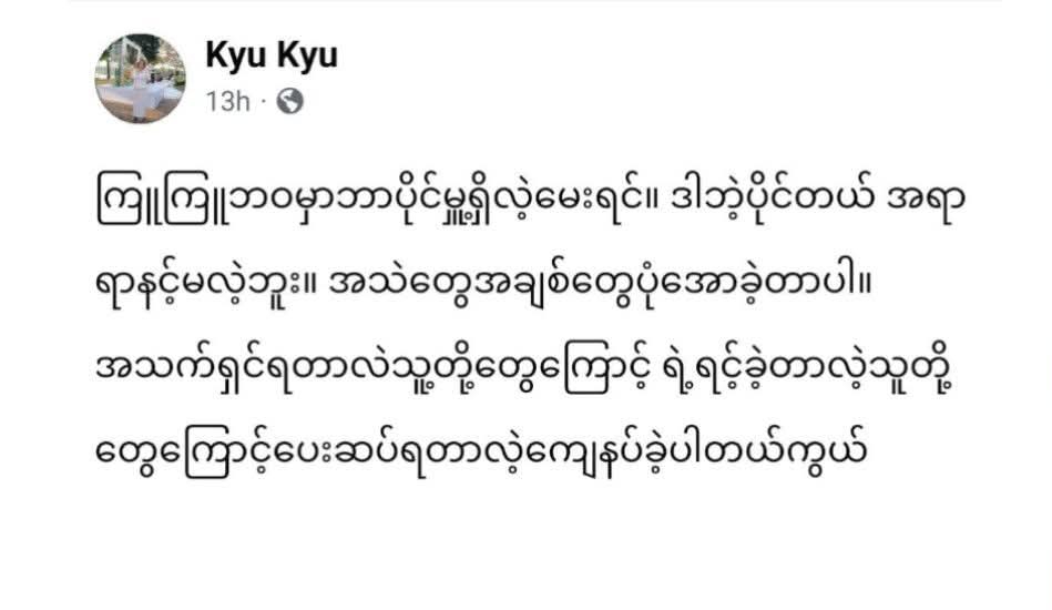 ကြူကြူဘဝမှာဘာပိုင်မှူ့ရှိလဲ့မေးရင်။ ဒါဘဲ့ပိုင်တယ် အရာရာနင့်မလဲ့ဘူး။