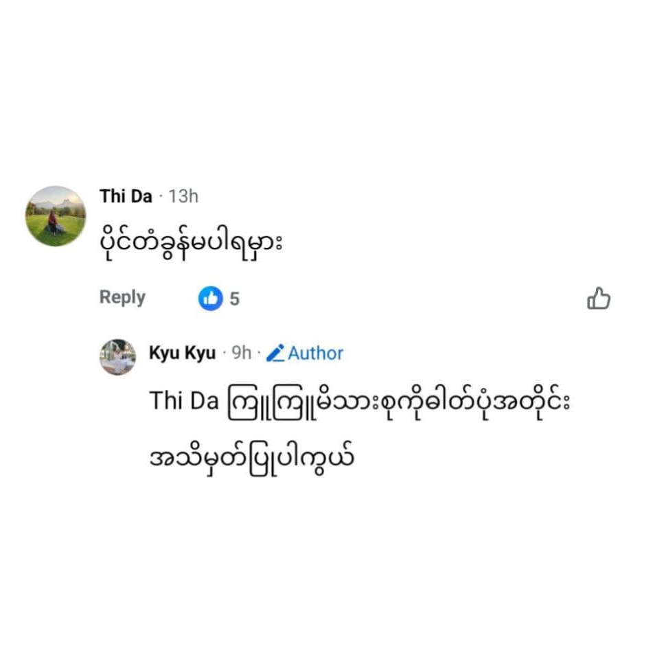 ကျမကသားသမီးတွေကို။ အကောင်းဆုံးတွေးပြီးလုပ်ပေးပါတယ်ကွယ်။ ငယ်ငယ်တုံးကလဲ့ပိုးကိုက်ခခြင်ကိုက်မှာစိုးရိမ်လို့ အထိမခံဘူးကြီးလါရင် ကျမသားသမီးတွေပါဖြစ်ရမယ်ဆိုပြီးကြိုးစားခဲ့တယ်ဖြစ်လါတော့ရိုင်းဆိုင်းပြီးမိဘကိုမတန်သလိုဆက်ဆံတယ်ဘါမှမပြောခြင်လိုထိုင်ကြည့်နေပါတယ်ကွယ်သူအကြိုးသူခံပါစေ။