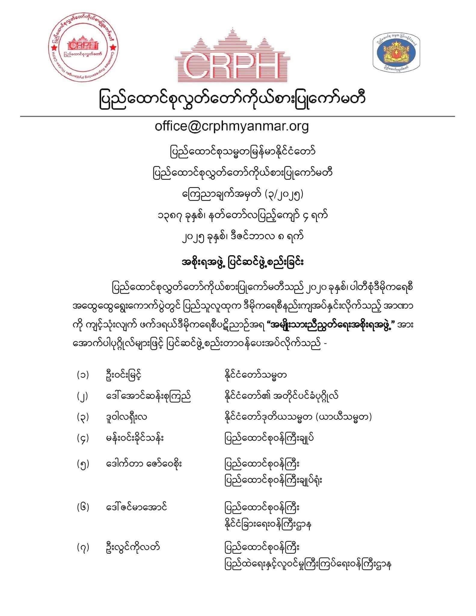 အမျိုးသားညီညွတ်ရေးအစိုးရ (NUG) အဖွဲ့ကို ယခုနှစ်ကုန်ပိုင်းတွင် အပြောင်းအလဲ ပြုလုပ်မည်ဟု ထုတ်ဖော်ပြောဆိုထားပြီးနောက် ဒုတိယဝန်ကြီးအဆင့်ရှိသူများကို ရာထူးတိုးမြှင့်ပေးခြင်း၊ ဝန်ကြီးဌာ နများကို ပေါင်းစည်းလျှော့ချခြင်းများဖြင့် NUG အစိုးရအဖွဲ့ကို ပြင်ဆင်ဖွဲ့စည်းလိုက်ကြောင်း ပြည်ထောင်စု လွှတ်တော်ကိုယ်စားပြုကော်မတီ (CRPH) က ထုတ်ပြန်သည်။