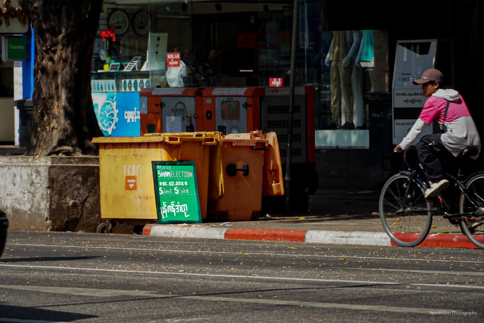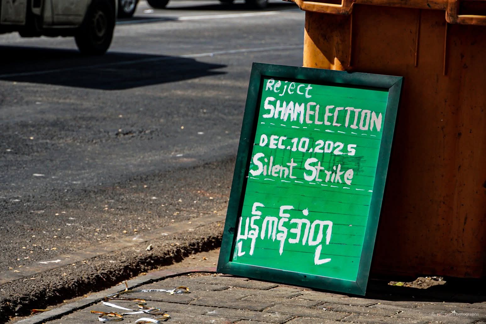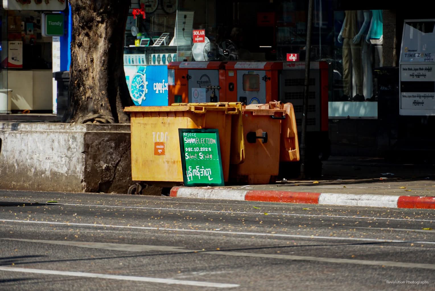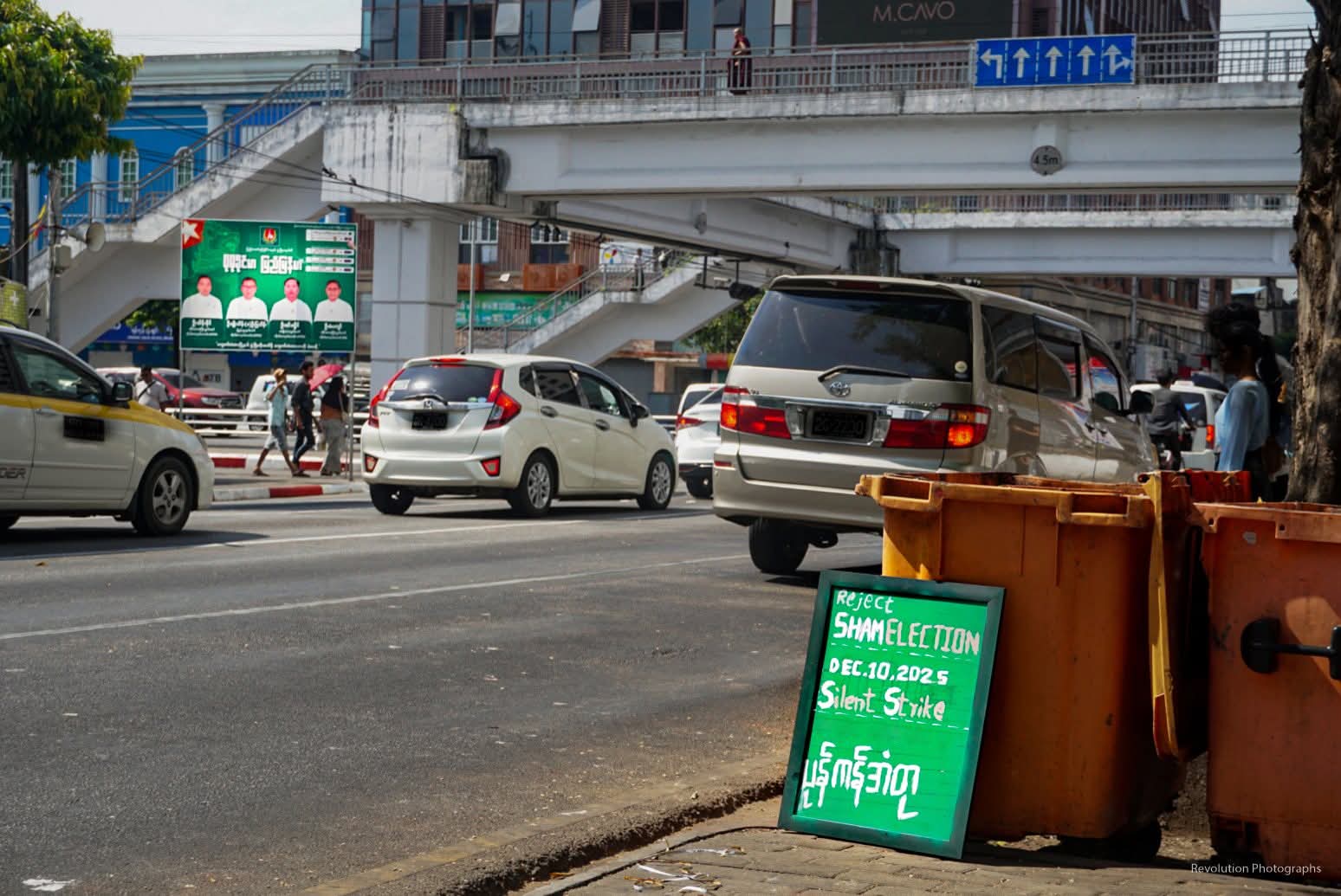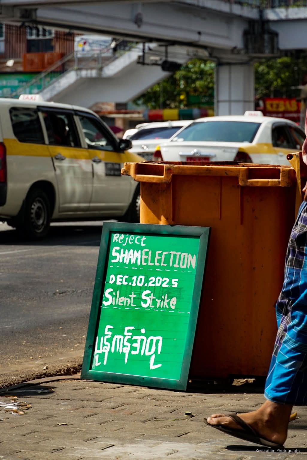 ရန်ကုန်မြို့လယ်ခေါင်တွင် ဒီဇင်ဘာလ ၁၀ ရက်နေ့ အသံတိတ်သပိတ်တွင် ပြည်သူများ ပူးပေါင်းပါဝင်ရေး နှင့် စစ်တပ်၏ အတုအယောင် ရွေးကောက်ပွဲ ဆန့်ကျင်ရေးအတွက် ရန်ကုန်လူထုသပိတ်က ယနေ့ ဆိုင်းဘုတ်ထောင် နှိုးဆော် လိုက်သည်။