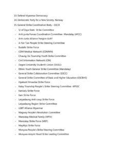 စစ်ကောင်စီက မြောက်ဦးဆေးရုံကို ဗုံးကြဲတိုက်ခိုက်မှု လုပ်ရပ်နဲ့ပတ်သက်ပြီး တော်လှန်ရေးအင်အားစုတွေဖြစ်တဲ့ ဦးမင်းကိုနိုင်အပါအဝင် လူပုဂ္ဂိုလ်နဲ့အဖွဲအစည်း စုစုပေါင်း ၄၅ဖွဲ့ပါဝင်တဲ့ တော်လှန်သွေးချင်းများ သန္နိဌာန်ပြုချက်ကို အထွေထွေသပိတ် ပေါင်းစပ်ညှိနှိင်းရေးအင်အားစု(GSCB)က ဒီကနေ့ည ဒီဇင်ဘာ ၁၆ ရက်မှာထုတ်ပြန်ခဲ့ပါတယ်။
