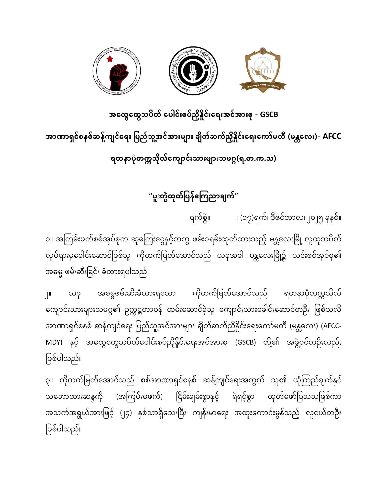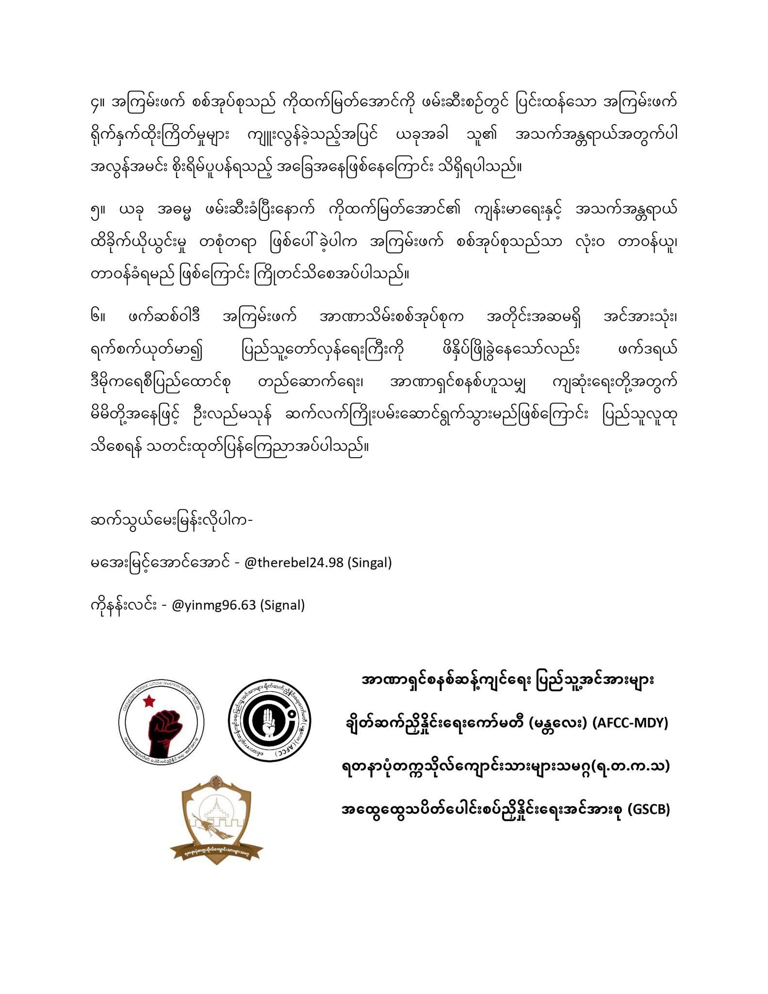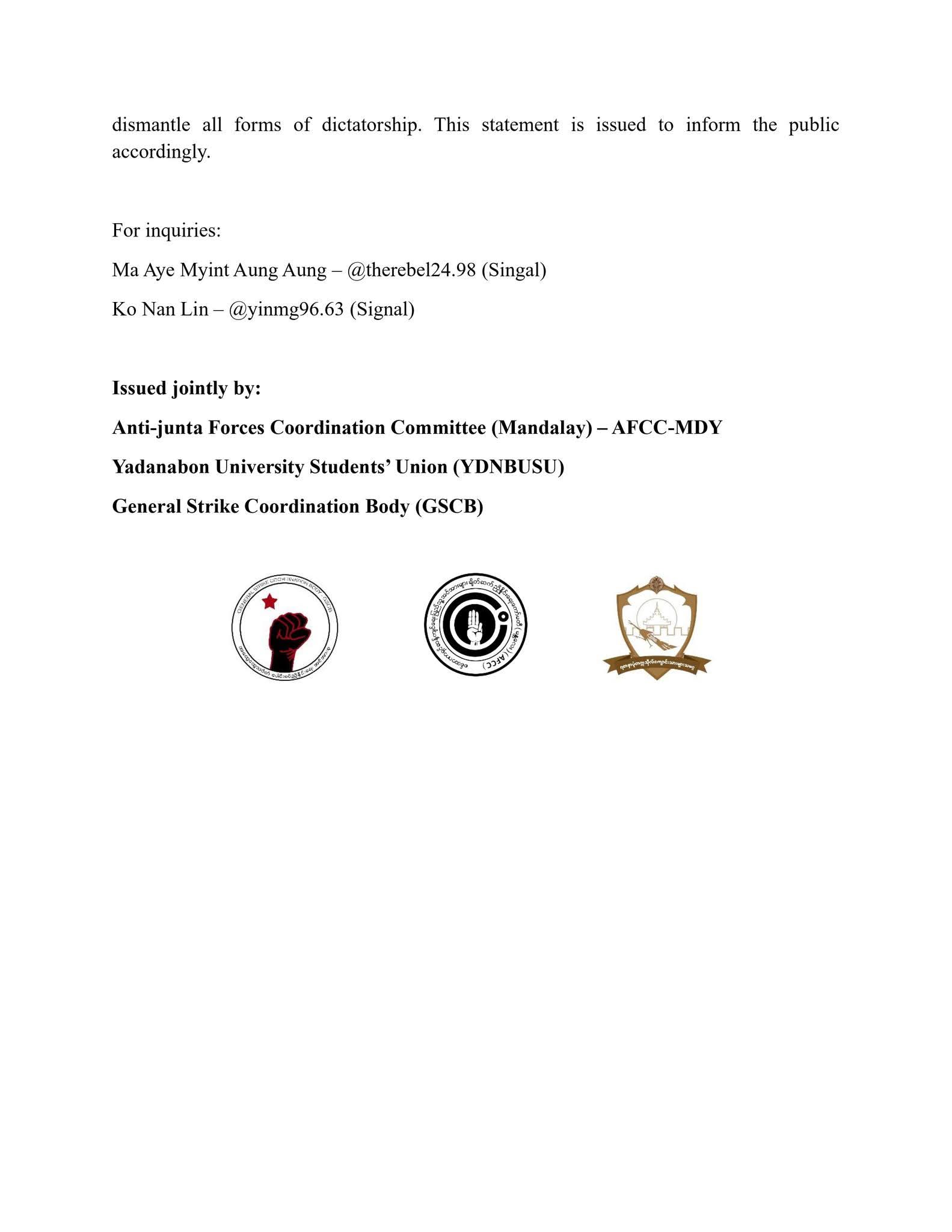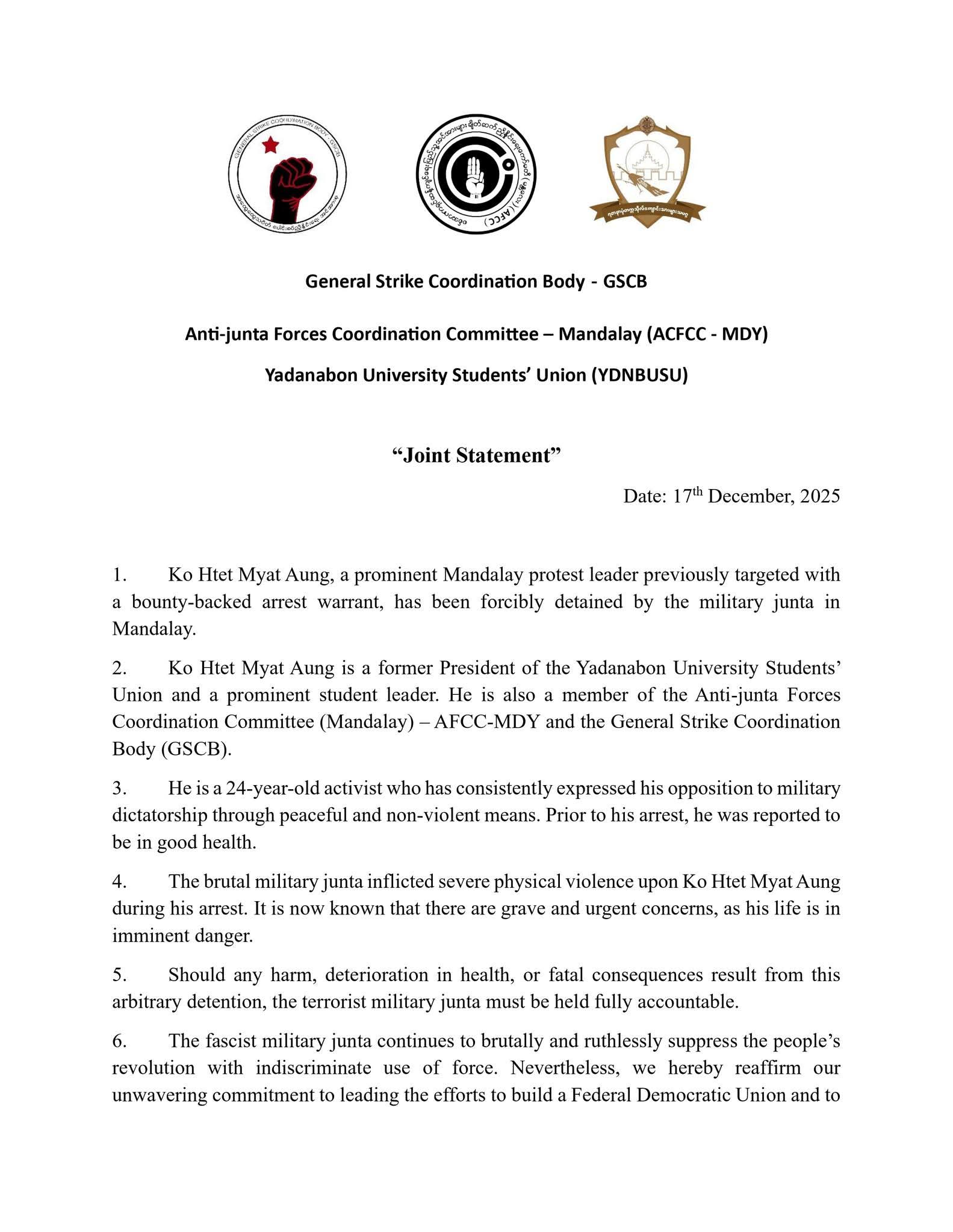 အာဏာရှင်စနစ် ဆန့်ကျင်ရေး ပြည်သူ့အင်အားများ ချိတ်ဆက် ညှိနှိုင်းရေးကော်မတီ (မန္တလေး) (AFCC-MDY)၊ ရတနာပုံတက္ကသိုလ်ကျောင်းသားများသမဂ္ဂ (ရ.တ.က.သ)နဲ့ အထွေထွေသပိတ် ပေါင်းစပ်ညှိနှိုင်းရေးအင်အားစု (GSCB)တို့က ဒီဇင်ဘာ ၁၇ ရက် ညမှာ အရေးပေါ် ပူးတွဲသတင်း ထုတ်ပြန်လာတာပါ။