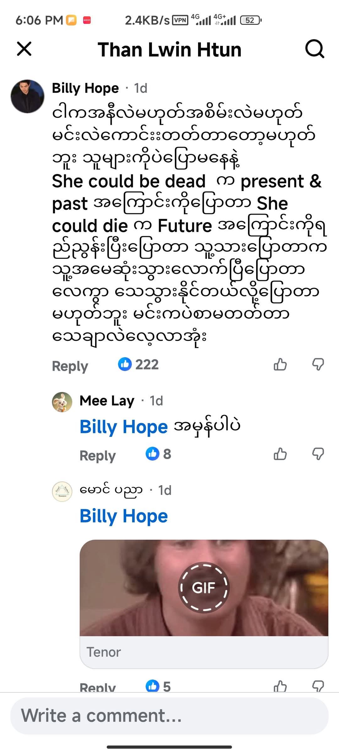 My name is Mg Hla. My father is U Mya. I go to school everyday ဆိုတာလောက်ပဲ တတ်သူတွေက She could be dead ဆိုတဲ့ အသုံးအနှုန်းမျိုးကို နားမလည်နိုင်ဘူးလေ ။