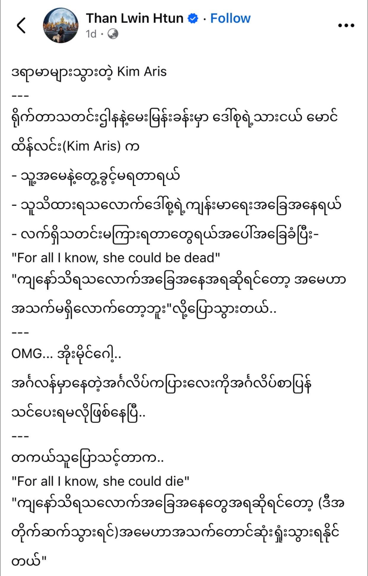 ဘီဘီစီ နဲ့ ဗီအိုအေ မှာ အလုပ်လုပ်ခဲ့တယ် ဆိုတဲ့ ကိုသန်းလွင်ထွန်း ဆိုသူက “ဒရာမာ များသွားတဲ့ Kim Aris” ဆိုပြီး ပို့စ်တခု လွန်ခဲ့တဲ့ ၂ ရက်က တင်ပါတယ် ။ သူကပြောပြန်သေးတယ် ၊ အင်္ဂလန်မှာ နေတဲ့ အင်္ဂလိပ်ကပြားလေးကို အင်္ဂလိပ်စာ ပြန်သင်ပေးရမလို ဖြစ်နေပြီတဲ့ ။ နိုင်ငံရေးတွန်းအားတွေကြောင့် ခုလို အင်္ဂလိပ်စကား အမှားကို ပြောသွားတာတဲ့ ၊ ဒရာမာ အခင်းလွန်သွားတယ် တဲ့ ။