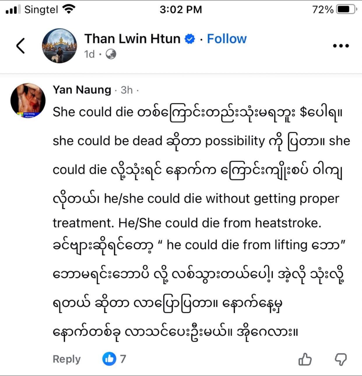 ကိုထိန်လင်းကို မိုက်ရိုင်းစော်ကားထားတဲ့ သန်းလွင်ထွန်းရေးထား တဲ့ post သွားဆဲလို့ရအောင် ကွန်မန့်မှာ ပေးလိုက်တယ်။