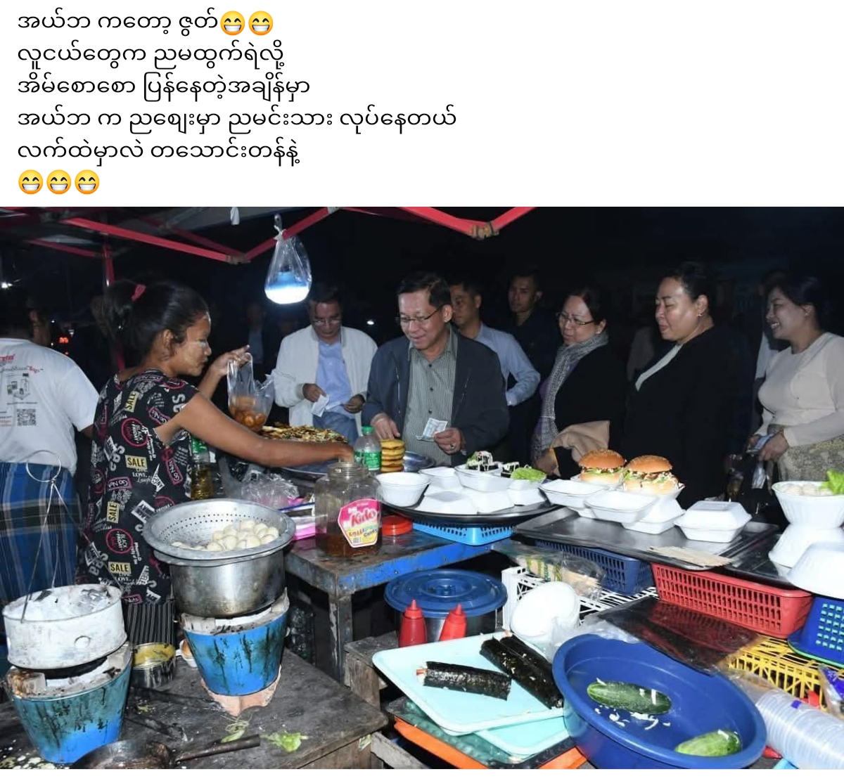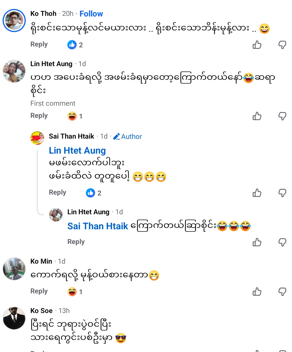 ” အဘ(မူရင်း အယ်ဘ) ကတော့ ဇွတ်။ လူငယ်တွေက ညဘက်မထွက်ရဲလို့ အိမ်စောစောပြန်နေရတဲ့ အချိန်မှာ အဘ(မူရင်း အယ်ဘ) က ညစျေးမှာ ညမင်းသားလုပ်နေတယ်” ဟု လှောင်ပြောင်သည့် အီမိုဂျီများရောနှောကာ ဦးစိုင်းသန်းထိုက်က ၄င်း၏ လူမှုကွန်ရက် စာမျက်နှာတွင် ရေးသားထားသည်။
