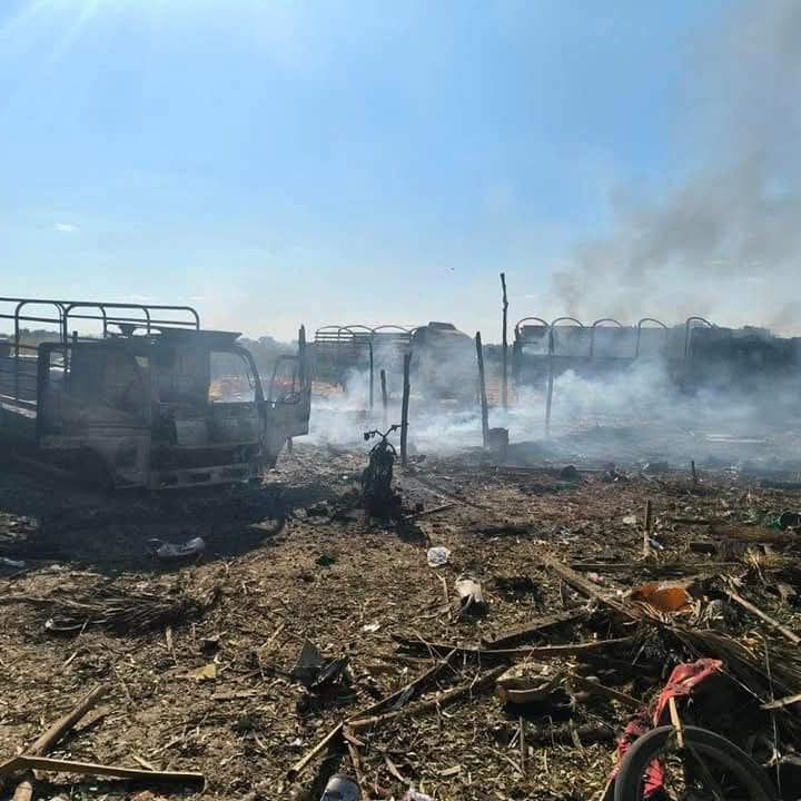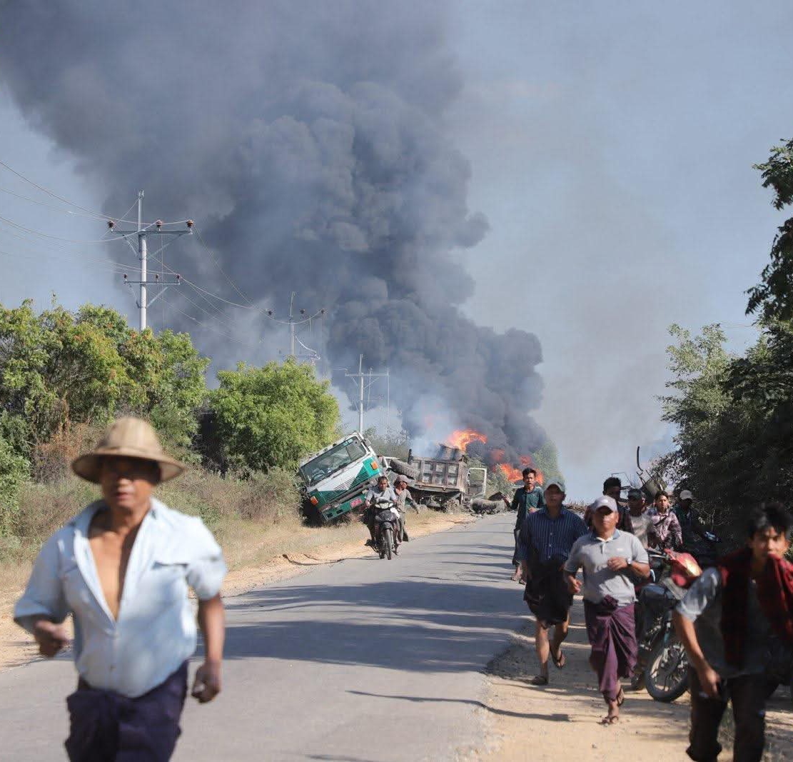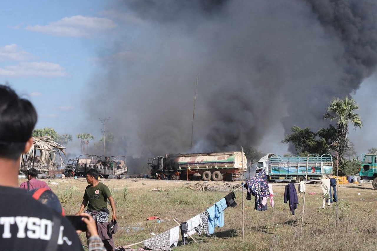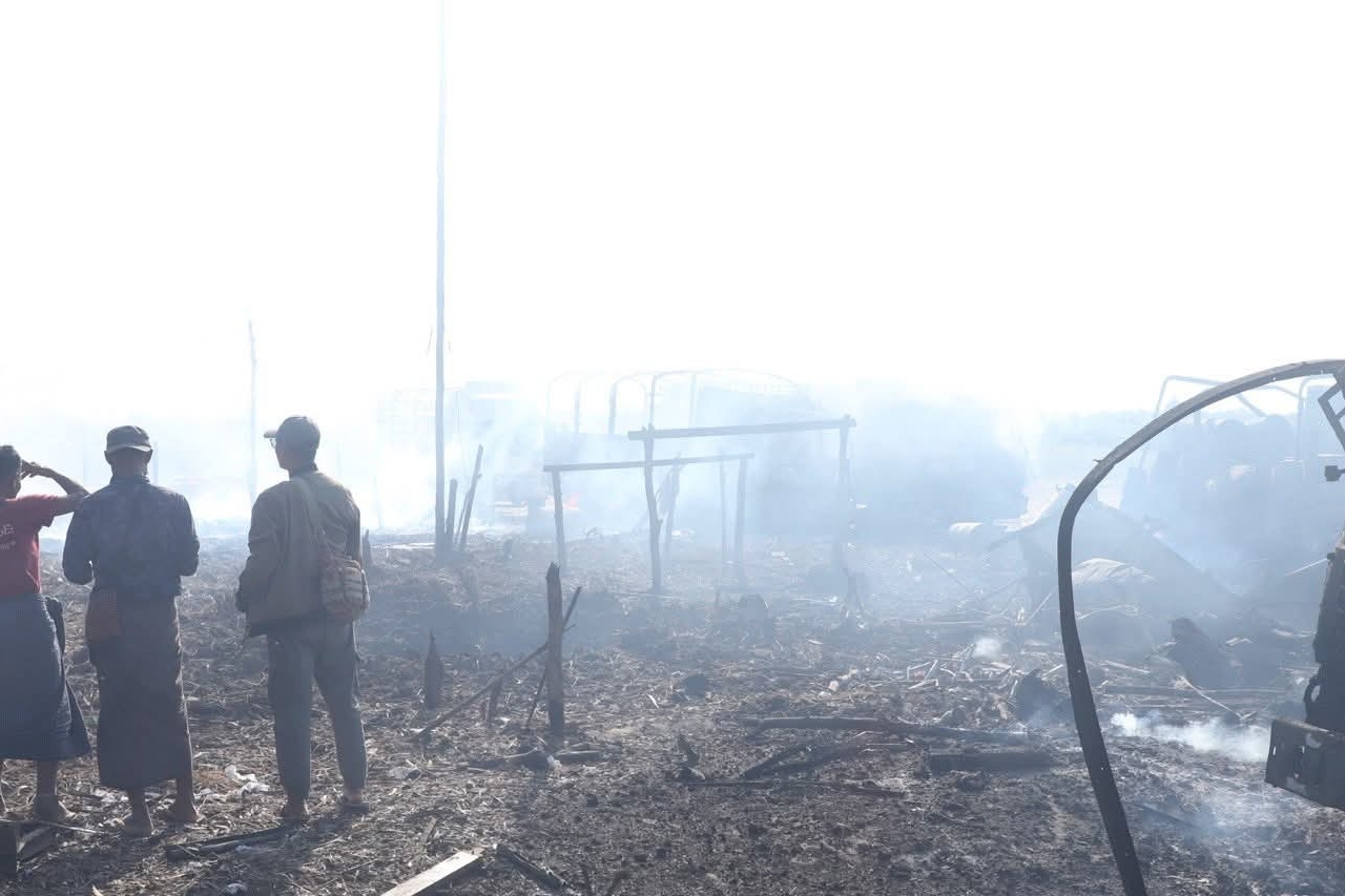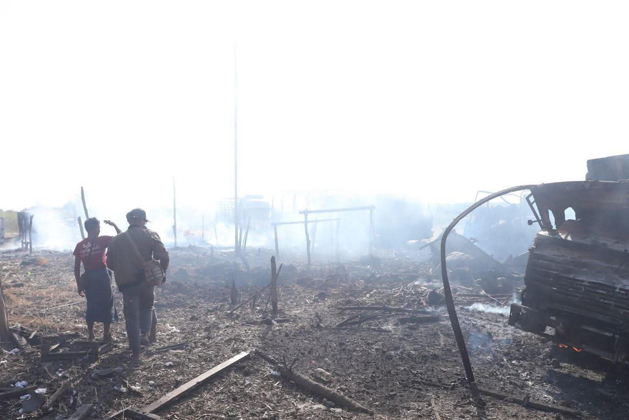 စစ်ကိုင်းတိုင်း၊ ခင်ဦးမြို့နယ်အရှေ့ဘက် စားသောက်ဆိုင်တန်းတစ်ခုကို ဒီဇင်ဘာ ၂၇ ရက်နေ့တွင် စစ်လေယာဉ်နှစ်စီးက ဗုံးကြဲ၊ ပစ်ခတ်ခဲ့ပြီးနောက် တွေ့မြင်ရသော မြင်ကွင်းများဖြစ်သည်။
