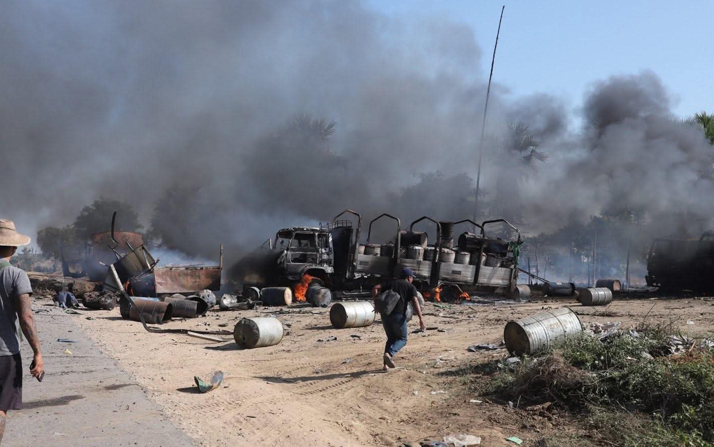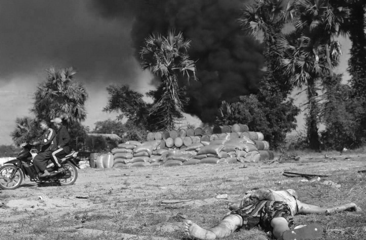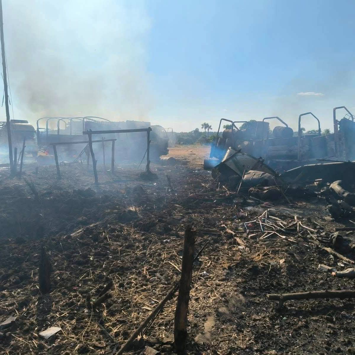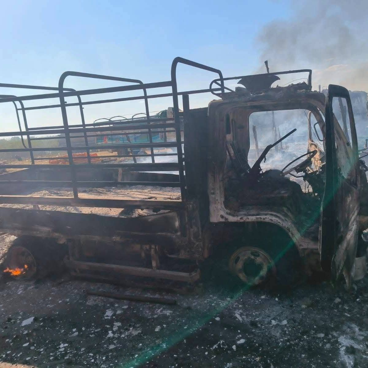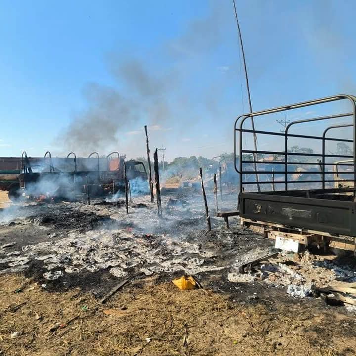 စစ်ကိုင်းတိုင်း၊ ခင်ဦးမြို့နယ်အရှေ့ဘက် စားသောက်ဆိုင်တန်းတစ်ခုကို ဒီဇင်ဘာ ၂၇ ရက်နေ့တွင် စစ်လေယာဉ်နှစ်စီးက ဗုံးကြဲ၊ ပစ်ခတ်ခဲ့ပြီးနောက် တွေ့မြင်ရသော မြင်ကွင်းများဖြစ်သည်။
