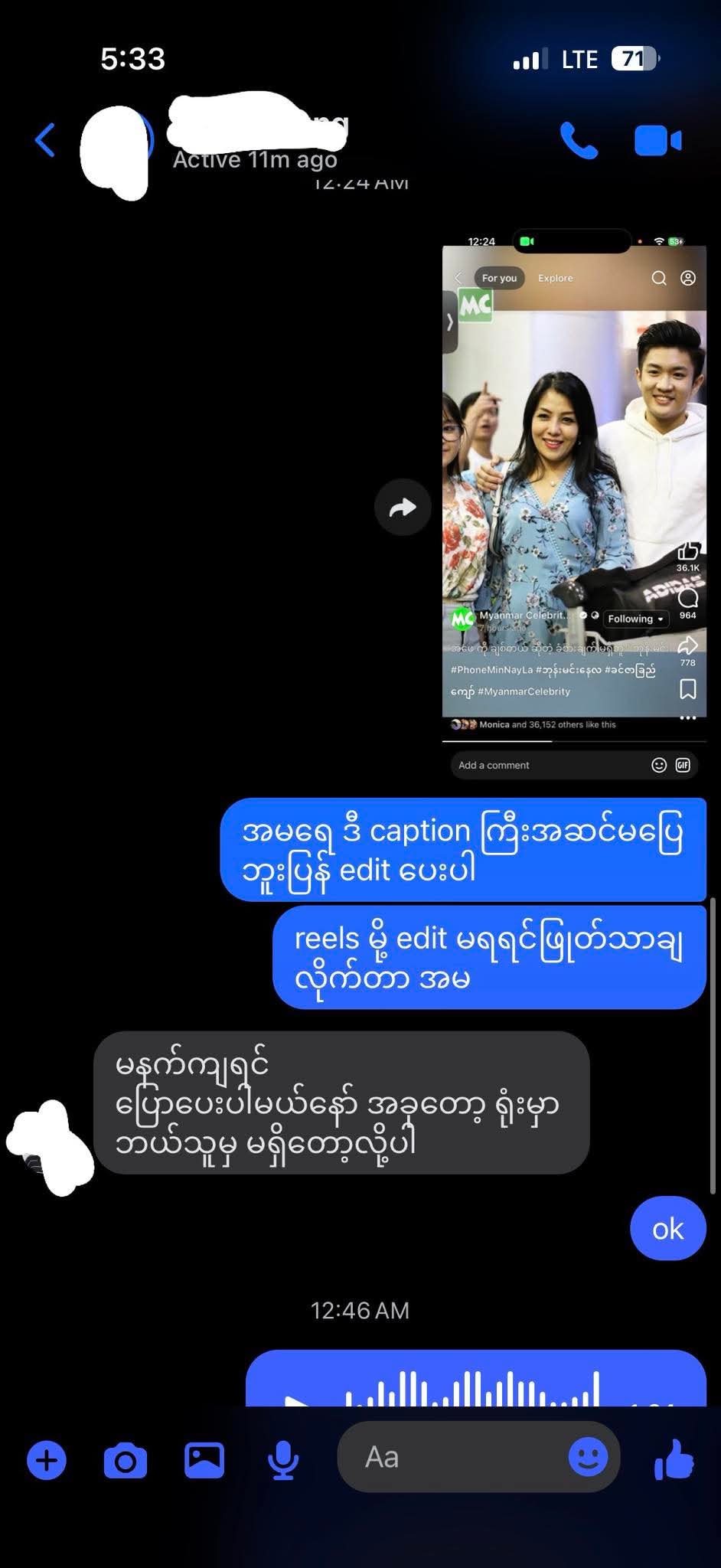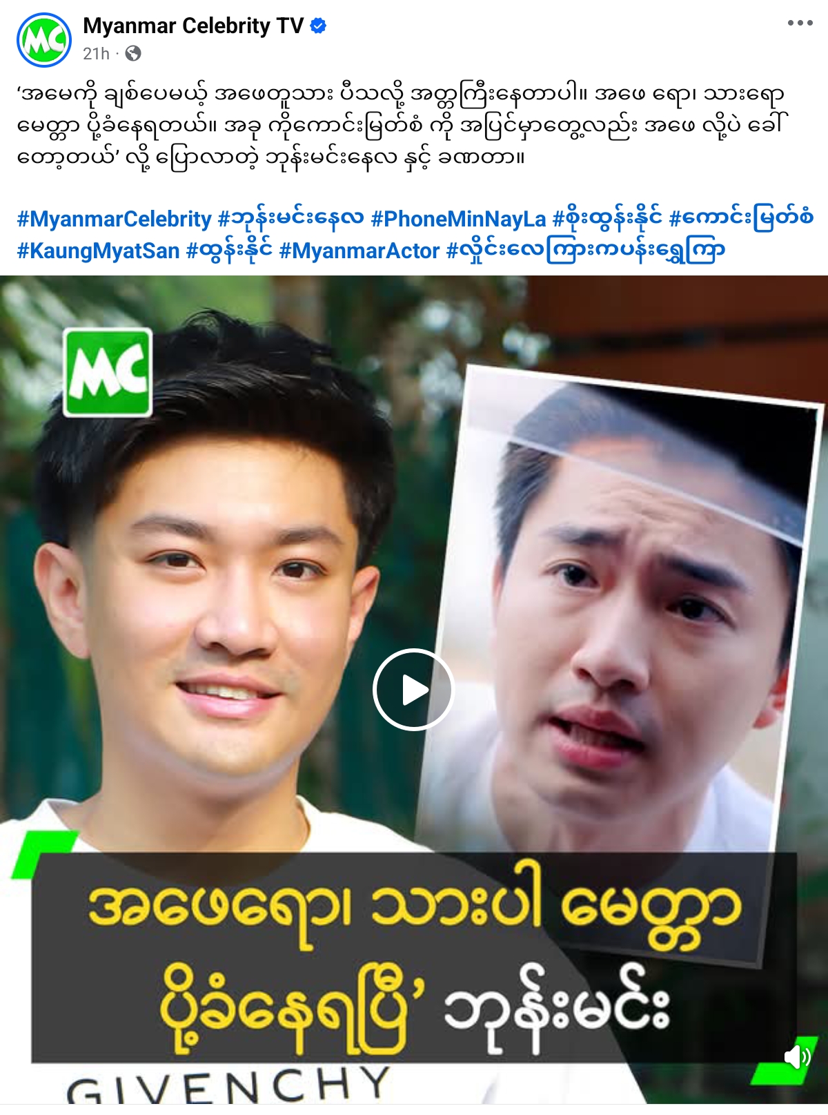 “လှိုင်းလေကြားကပန်းရွှေကြာ” ဇာတ်လမ်းတွဲအတွက်ဖြေထားတဲ့ Interview ကို လူစိတ်ဝင်စားဖို့အတွက်သူများမိသားစု Personal ကိုဖြတ်ညှပ်ကပ် Reels လုပ်ပြီး Caption ကအစ interview ထဲမှာမပြောတဲ့စာသားနဲ့ပွဲရှာထားပါတယ်