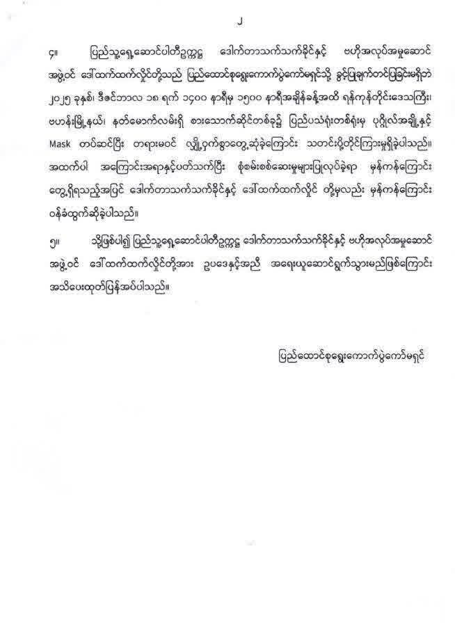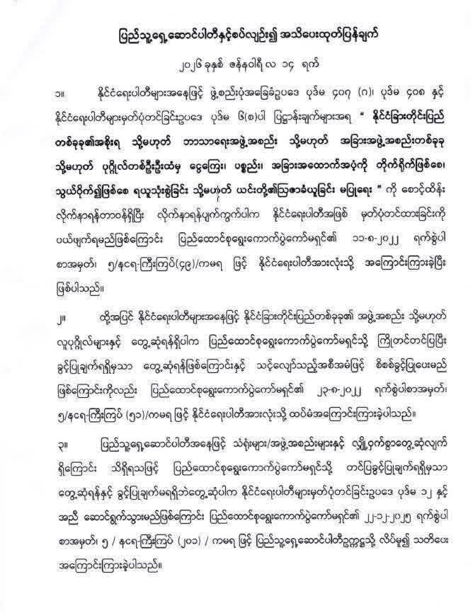 နိုင်ငံရေးပါတီများ အနေဖြင့် ဖွဲ့စည်းပုံအခြေခံ ဥပဒေ ပုဒ်မ ၄၀၇(ဂ)၊ ၄၀၈နှင့်နိုင်ငံရေးပါတီများ မှတ်ပုံတင်ခြင်း ဥပဒေပုဒ်မ ၆(စ) ပါ ပြဋ္ဌာန်းချက်များအရ နိုင်ငံခြား တိုင်းပြည်တခုခု အစိုးရ(သို့) ဘာသာရေးအဖွဲ့အစည်း(သို့) အခြားအဖွဲ့အစည်း တခုခု (သို့) လူပုဂ္ဂိုလ် တဦးဦးထံမှ ငွေကြေး၊ ပစ္စည်း၊ အခြား အထောက်အပံ့ကို တိုက်ရိုက်ဖြစ်စေ၊ သွယ်ဝိုက် ဖြစ်စေ ရယူသုံးစွဲခြင်း(သို့) ယင်းတို့ ဩဇာခံခြင်း မပြုရေးကို စောင့်ထိန်းလိုက်နာရန် တာဝန်ရှိပြီး ပျက်ကွက်ပါက နိုင်ငံရေးပါတီအဖြစ် မှတ်ပုံတင်ထားခြင်းကိုပယ်ဖျက်ရမည်ဖြစ်ကြောင်း ၁၁-၈-၂၀၂၂ ရက်စွဲဖြင့် နိုင်ငံရေးပါတီ အားလုံးသို့ အကြောင်းကြားပြီးဖြစ်ကြောင်း ရွေးကောက်ပွဲကော်မရှင်ကထုတ်ပြန်ထားသည်။