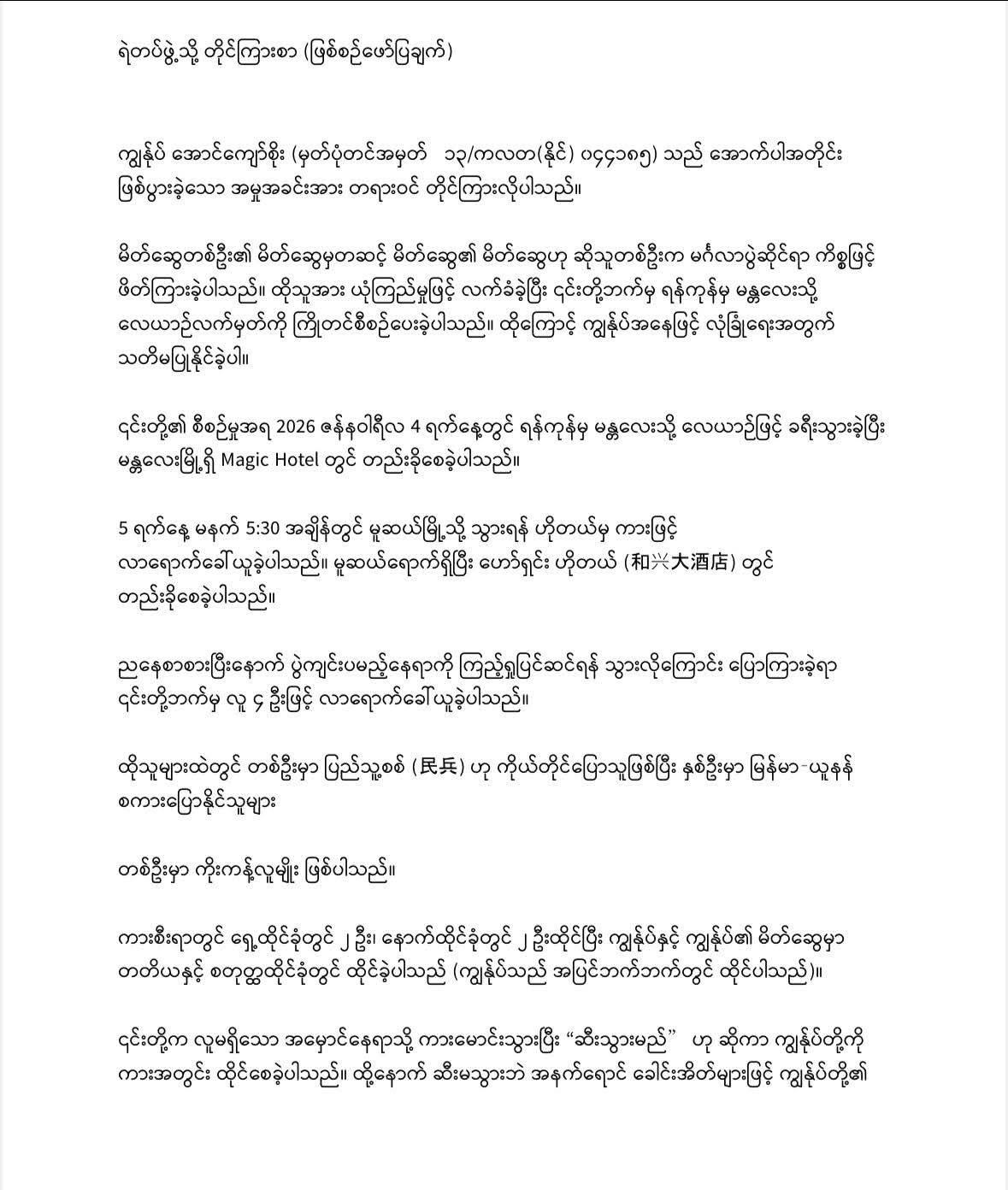 ၎င်းတို့၏ စီစဉ်မှုအရ 2026 ဇန်နဝါရီလ 4 ရက်နေ့တွင် ရန်ကုန်မှ မန္တလေးသို့ လေယာဉ်ဖြင့် ခရီးသွားခဲ့ပြီး မန္တလေးမြို့ရှိ Magic Hotel တွင် တည်းခိုစေခဲ့ပါသည်။