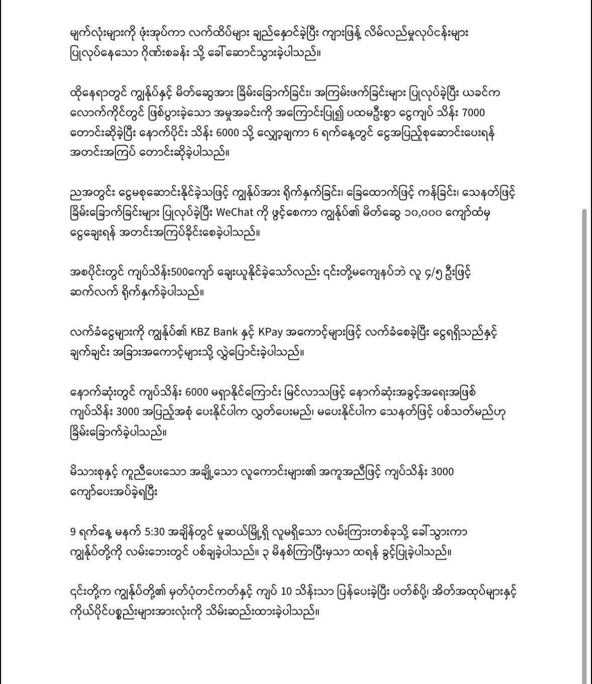 ညအတွင်း ငွေမစုဆောင်းနိုင်ခဲ့သဖြင့် ကျွန်ုပ်အား ရိုက်နှက်ခြင်း၊ ခြေထောက်ဖြင့် ကန်ခြင်း၊ သေနတ်ဖြင့် ခြိမ်းခြောက်ခြင်းများ ပြုလုပ်ခဲ့ပြီး WeChat ကို ဖွင့်စေကာ ကျွန်ုပ်၏ မိတ်ဆွေ ၁၀,၀၀၀ ကျော်ထံမှ ငွေချေးရန် အတင်းအကြပ်ခိုင်းစေခဲ့ပါသည်။