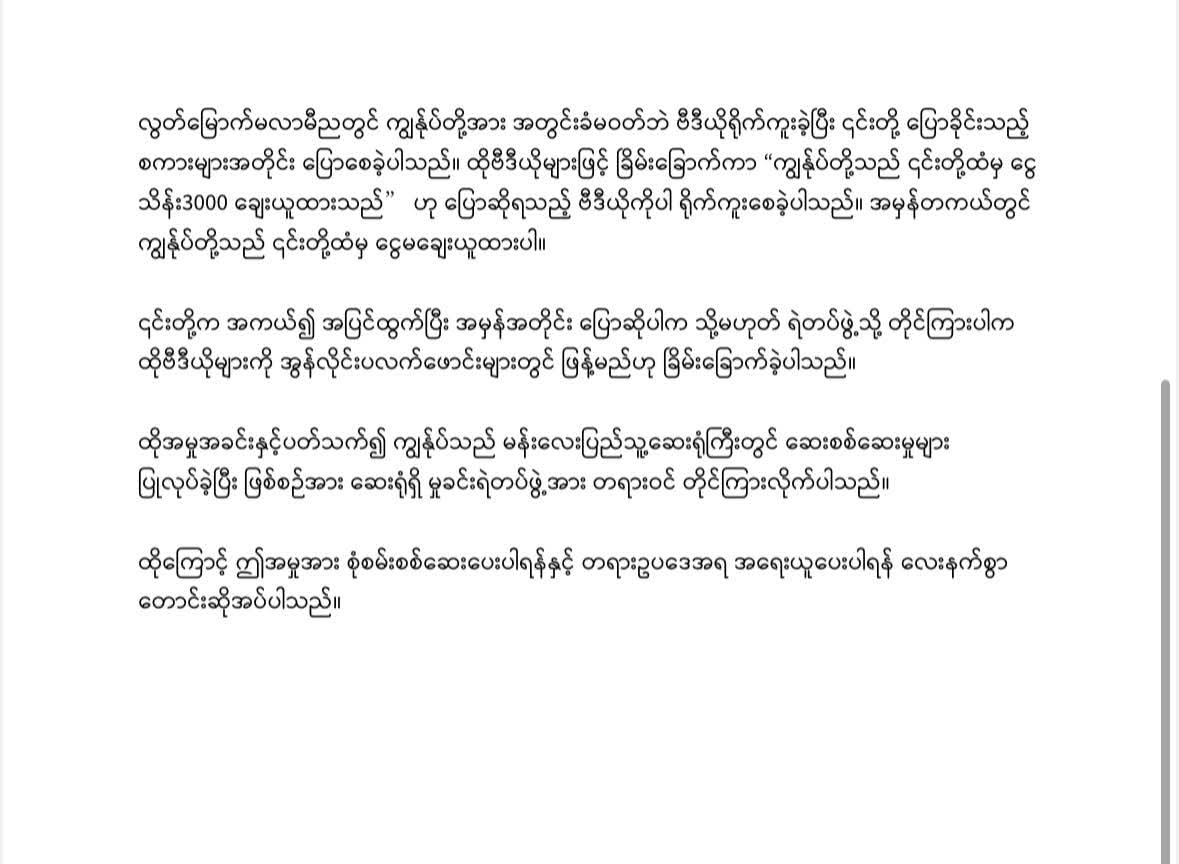ထိုကြောင့် ဤအမှုအား စုံစမ်းစစ်ဆေးပေးပါရန်နှင့် တရားဥပဒေအရ အရေးယူပေးပါရန် လေးနက်စွာ တောင်းဆိုအပ်ပါသည်။