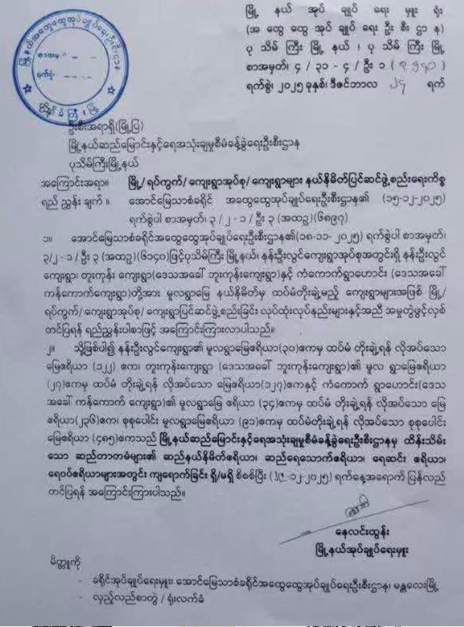 နန်းဦးလွင်ကျေးရွာကို မူလရွာမြေဧရိယာ ၃၀ ဧက ကနေ ထပ်မံ တိုးချဲ့ဖို့ လိုအပ်တဲ့ မြေဧရိယာ ၁၂၂ ဧက၊ တူးကုန်းကျေးရွာ (ဘူးကုန်း)ကို မူလ ရွာမြေဧရိယာ ၂၇ ဧကကနေ ထပ်မံ တိုးချဲ့ဖို့ လိုအပ်တဲ့ မြေဧရိယာ ၁၂၇ ဧကနဲ့ ကံကောက် ရွာဟောင်း (ကန်ကောက်) မူလရွာမြေ ဧရိယာ ၃၄ ဧက ကနေ ထပ်မံ တိုးချဲ့ဖို့ လိုအပ်တဲ့ မြေ ဧရိယာ ၂၃၆ ဧက၊ စုစုပေါင်း မူလရွာမြေဧရိယာ ၉၁ ဧက ကနေ ထပ်မံတိုးချဲ့ဖို့ လိုအပ်တဲ့ စုစုပေါင်း မြေဧရိယာ ၄၈၅ ဧက အတွက် မြို့နယ်ဆည်မြောင်းနှင့် ရေအသုံးချမှု စီမံခန့်ခွဲရေး ဦးစီးဌာနက ထိန်းသိမ်းတဲ့ ဆည်တာတမံတွေရဲ့ ဆည်နယ်နိမိတ်ဧရိယာ၊ ဆည်ရေသောက်ဧရိယာ၊ ရေဆင်း ဧရိယာ၊ ရေဝပ်ဧရိယာတွေ အတွင်း ကျရောက်ခြင်း ရှိ၊မရှိ စိစစ်ပြီး ဒီဇင်ဘာ ၂၉ရက်မှာ ပြန်လည် တင်ပြဖို့ အကြောင်းကြားပါတယ်လို့ ဖေါ်ပြထားပါတယ်။