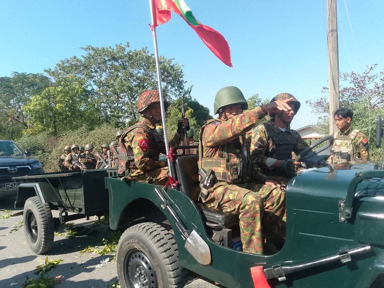ဓာတ်ပုံ – စစ်အုပ်စု၊ သပိတ်ကျင်းနယ် လိပ်ကျရွာကို ပြန်ရပြီးနောက် အောင်ပွဲခံနေတဲ့ စစ်အုပ်စု