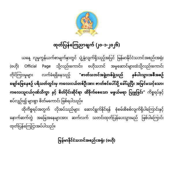ထိုကိစ္စရပ်အတွက် လိုအပ်သည်များ ဆောင်ရွက်နိုင်ရန် စုံစမ်းစိစစ်လျက်ရှိပါကြောင်းနှင့် နောက်ဆက်တွဲ အခြေအနေများအား ဆက်လက်သတင်းထုတ်ပြန်သွားမည်ဖြစ်ကြောင်း မြန်မာနိုင်ငံ သဘင်အစည်းအရုံးက ကြေညာသည်။