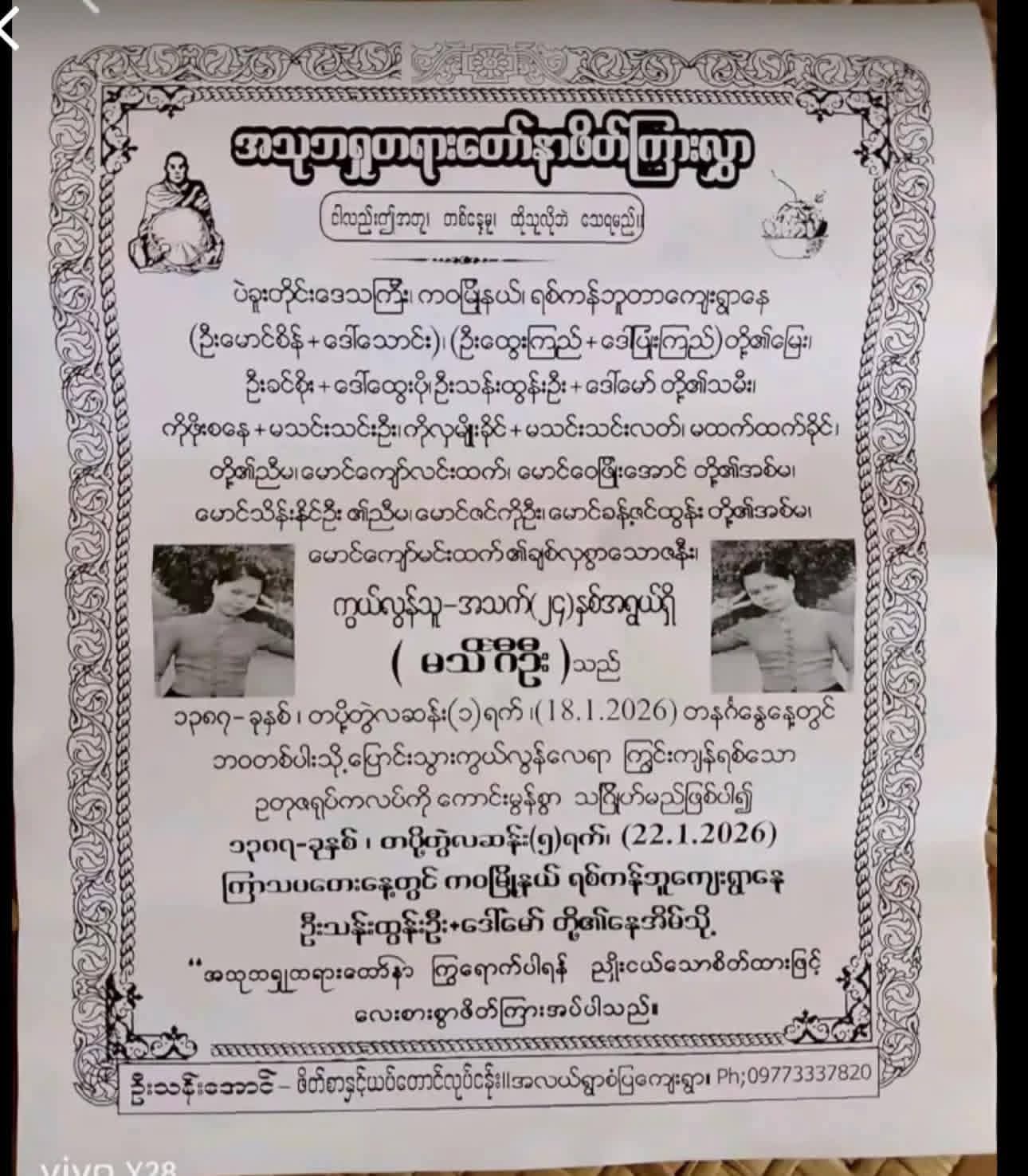 ပဲခူးတိုင်း၊ ကဝမြို့နယ်၊ ရစ်ကန်ဘူတာကျေးရွာက ယနေ့ကျင်းပသောမင်္ဂလာပွဲမှာ သတို့သမီးဖြစ်သူဟာ လွန်ခဲ့သော ရက်အနည်းငယ်က နှလုံးရောဂါကြောင့် အမောဖောက်ပြီး ဆုံးပါးသွားခဲ့ရပါတယ်။