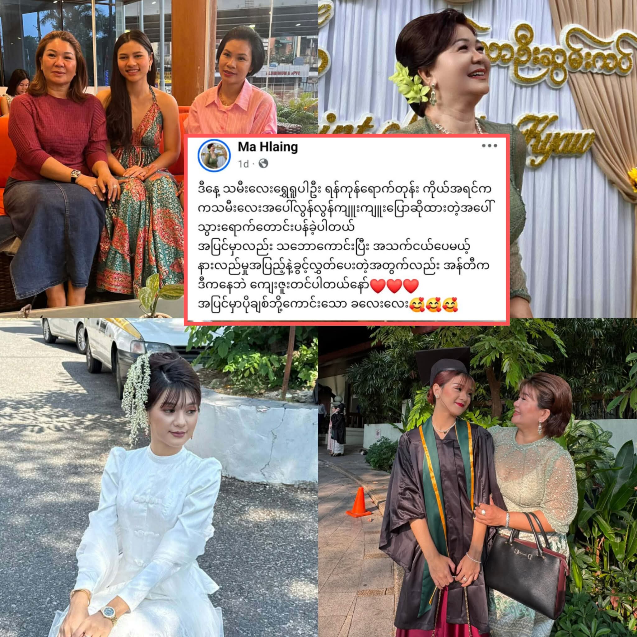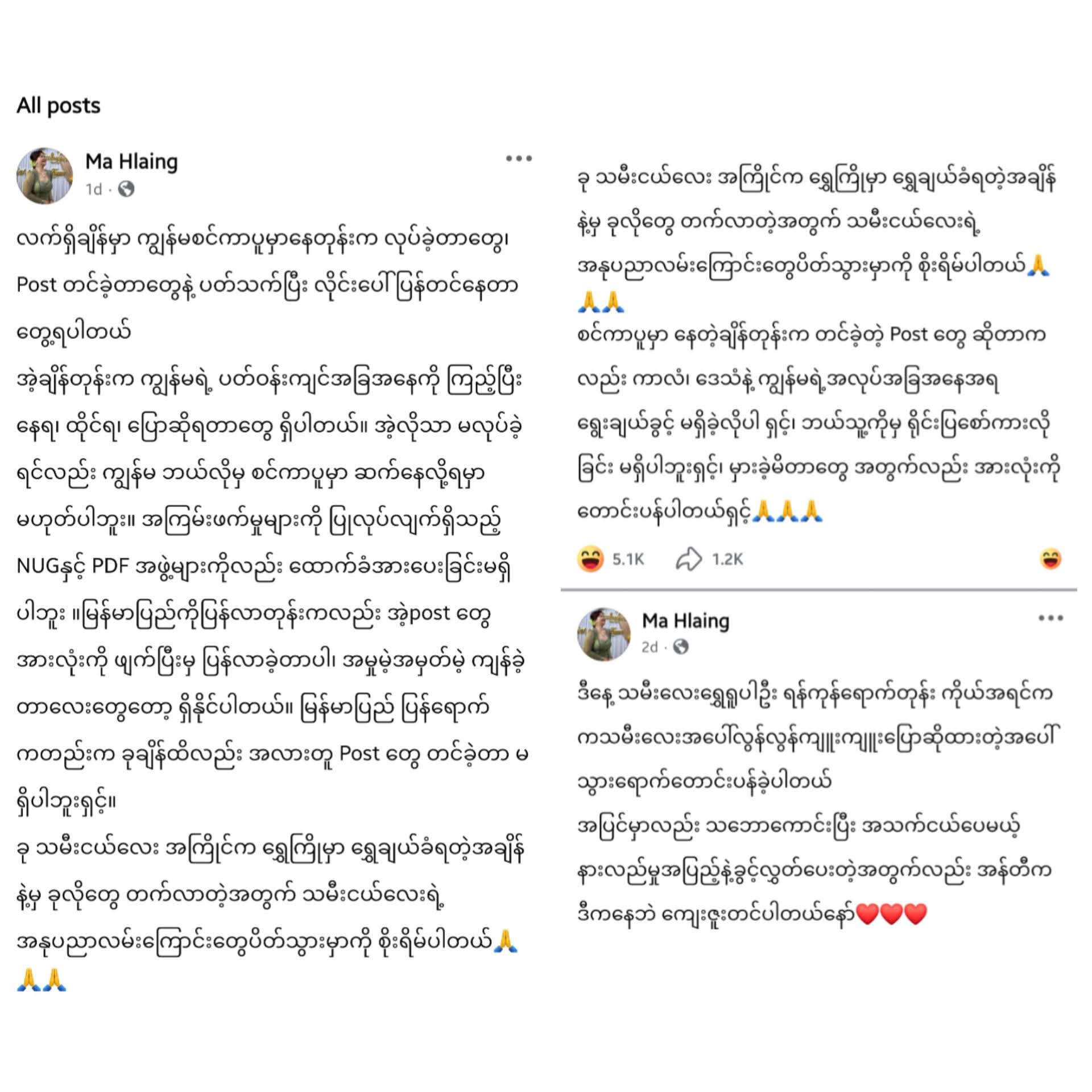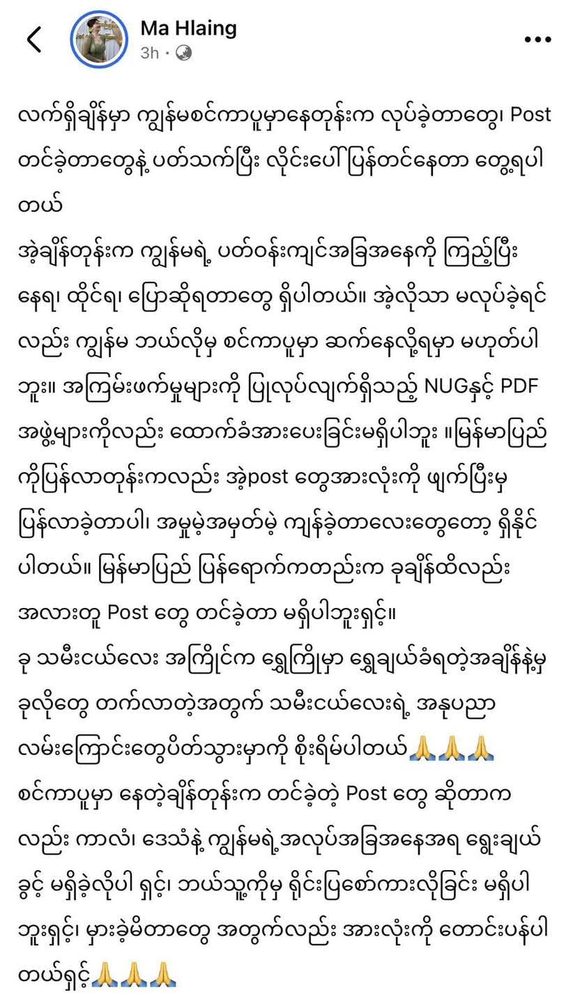 “စင်္ကာပူမှာ နေတုန်းက ကျွန်မရဲ့ ပတ်ဝန်းကျင် အခြေအနေကို ကြည့်ပြီး နေရ၊ ထိုင်ရ၊ ပြောဆိုရတာတွေ ရှိပါတယ်။ မဟုတ်ရင် စင်ကာပူမှာ ဆက်နေလို့ရမှာ မဟုတ်ပါဘူး။ အကြမ်းဖက်မှုတွေကို ပြုလုပ်လျက်ရှိတဲ့ NUG နှင့် PDF အဖွဲ့တွေကိုလည်း ထောက်ခံ အားပေးခြင်း မရှိပါဘူး။ မြန်မာပြည်ကို ပြန်လာတုန်းကလည်း အဲ့ Post တွေကို ဖျက်ပြီးမှ ပြန်လာခဲ့တာပါ။ သမီးလေးရဲ့ အနုပညာ လမ်းကြောင်း ပိတ်သွားမှာကို စိုးရိမ်ပါတယ်” လို့ သူရဲ့ ဖေ့ဘုတ်စာမျက်နှာမှာ ပြောဆိုခဲ့တာပါ။