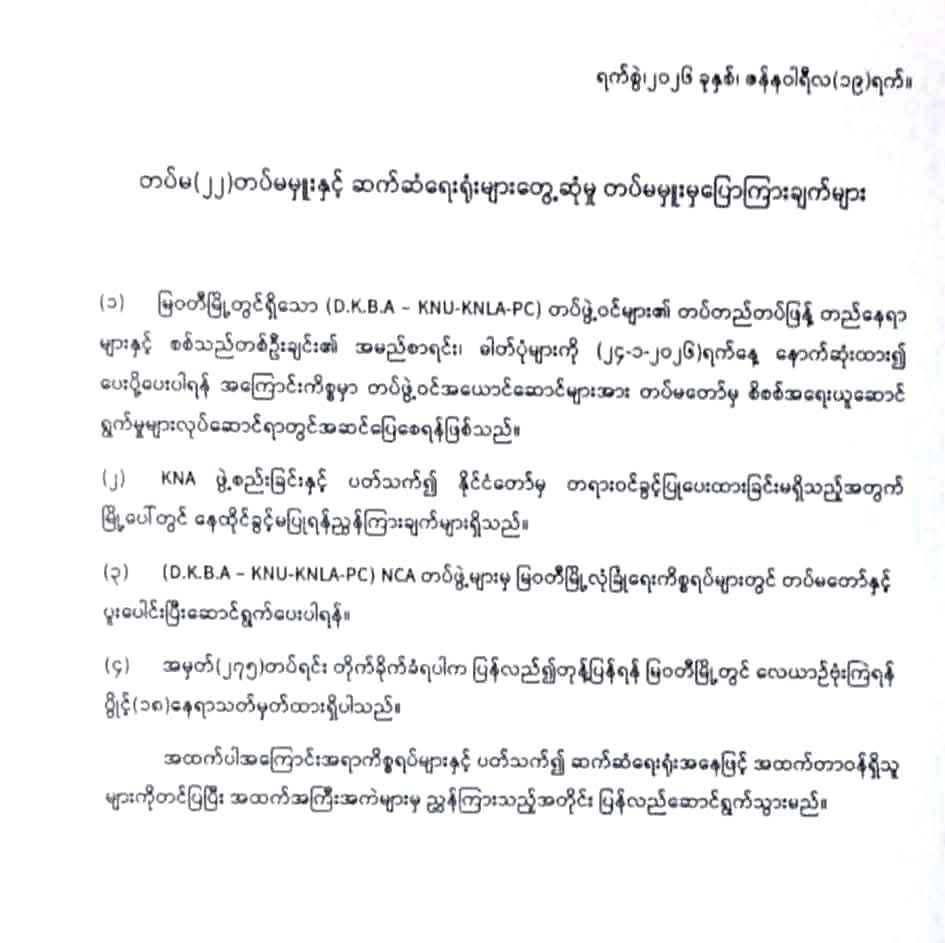 မြဝတီမြို့ရှိ သက်ဆိုင်ရာ လက်နက်ကိုင်တပ်ဖွဲ့ ၏ ဆက်ဆံရေးရုံးများနှင့် စစ်အုပ်စု တပ်မ ၂၂ တပ်မမှူးတို့ ဇန်နဝါရီ(၁၉)ရက်နေ့က တွေ့ဆုံမှုတွင် ထိုသို့ ညွှန်ကြားလိုက်ခြင်းဖြစ်သည်ဟု သိရသည်။
