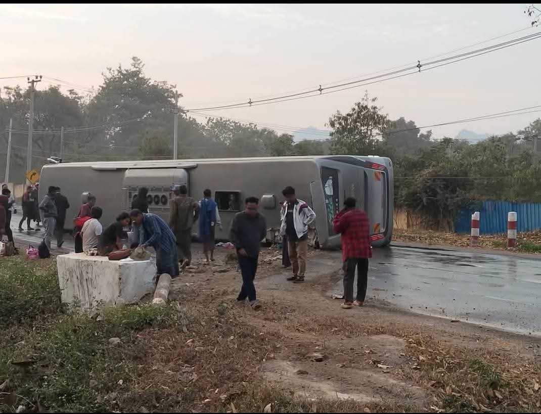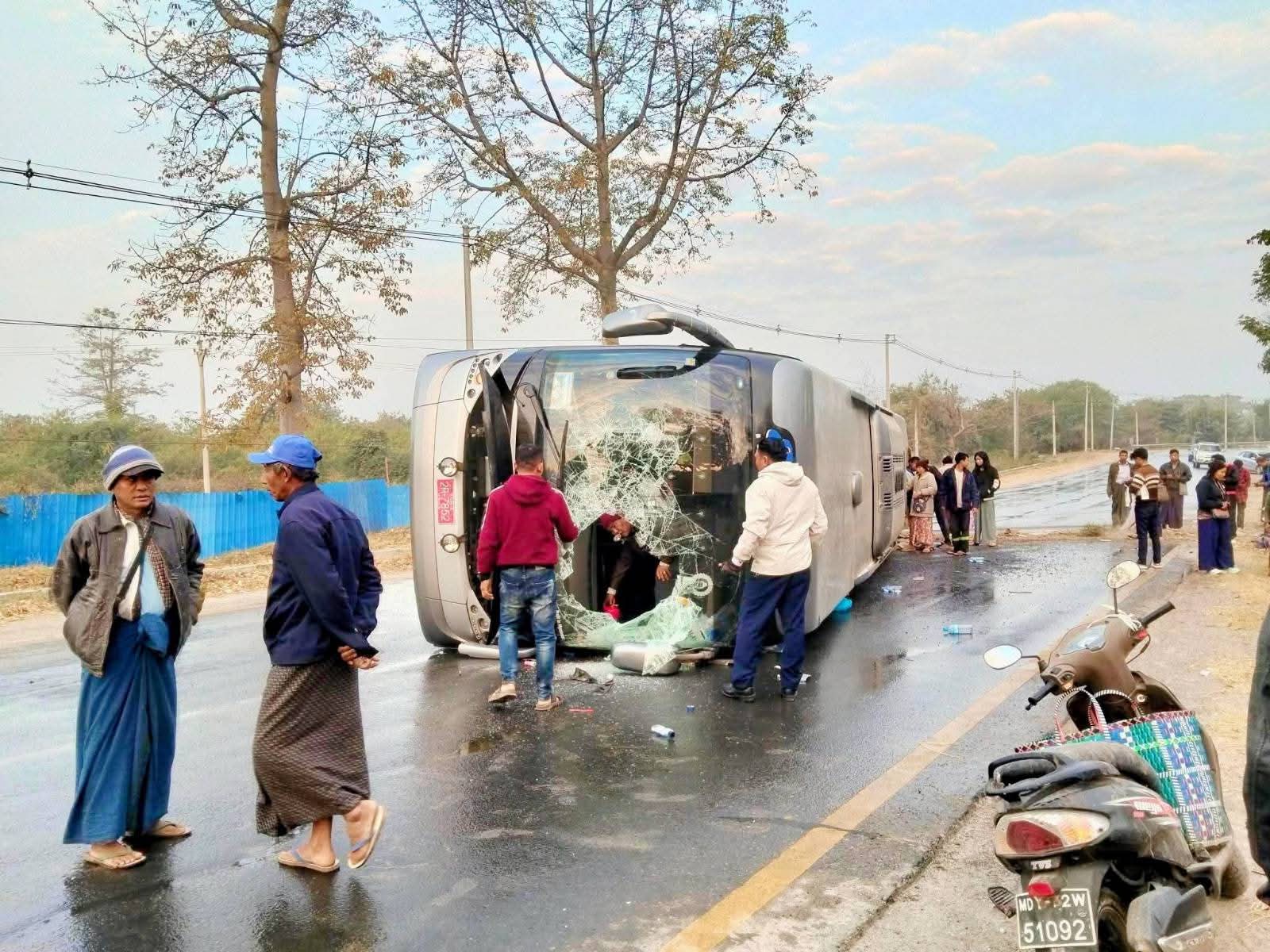 (တိမ်းမှောက်ခဲ့သော ခရီးသည်တင်ယာဥ်အား တွေ့ရစဥ်။ ဓာတ်ပုံ-Cj)