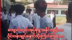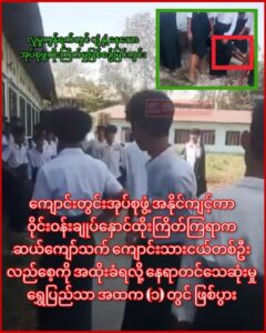 လူမှုကွန်ရက်မှာ ပျံ့နှံ့နေတဲ့ရုပ်သံထဲမှာလည်း လဲကျနေတဲ့ကျောင်းသားငယ်တစ်ဦးကို ကျောင်းသားအများအပြားက ဝိုင်းထားပြီး “တစ်ချက်တည်းထိုးတာကို ဖြစ်နေတယ်”လို့ ပြောနေတာ တွေ့မြင်ရပါတယ်။
