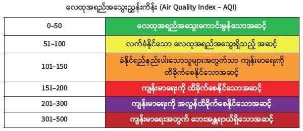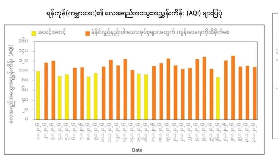 ရန်ကုန် (ကမ္ဘာအေး) ရှိ လေအရည်အသွေး စောင့်ကြည့်တိုင်းတာရေးစခန်းမှတစ်ဆင့် လေထုအတွင်းရှိ အချင်း ၂.၅ မိုက်ခရိုမီတာနှင့် အောက်သေးငယ်သော အမှုန်အမွှားများ (PM 2.5) ကို တိုင်းတာရာတွင် ပြီးခဲ့သည့် ဇန်နဝါရီလအတွင်း လေထုညစ်ညမ်းမှု သိသိသာသာ ရှိနေခဲ့ကြောင်း သိရသည်။