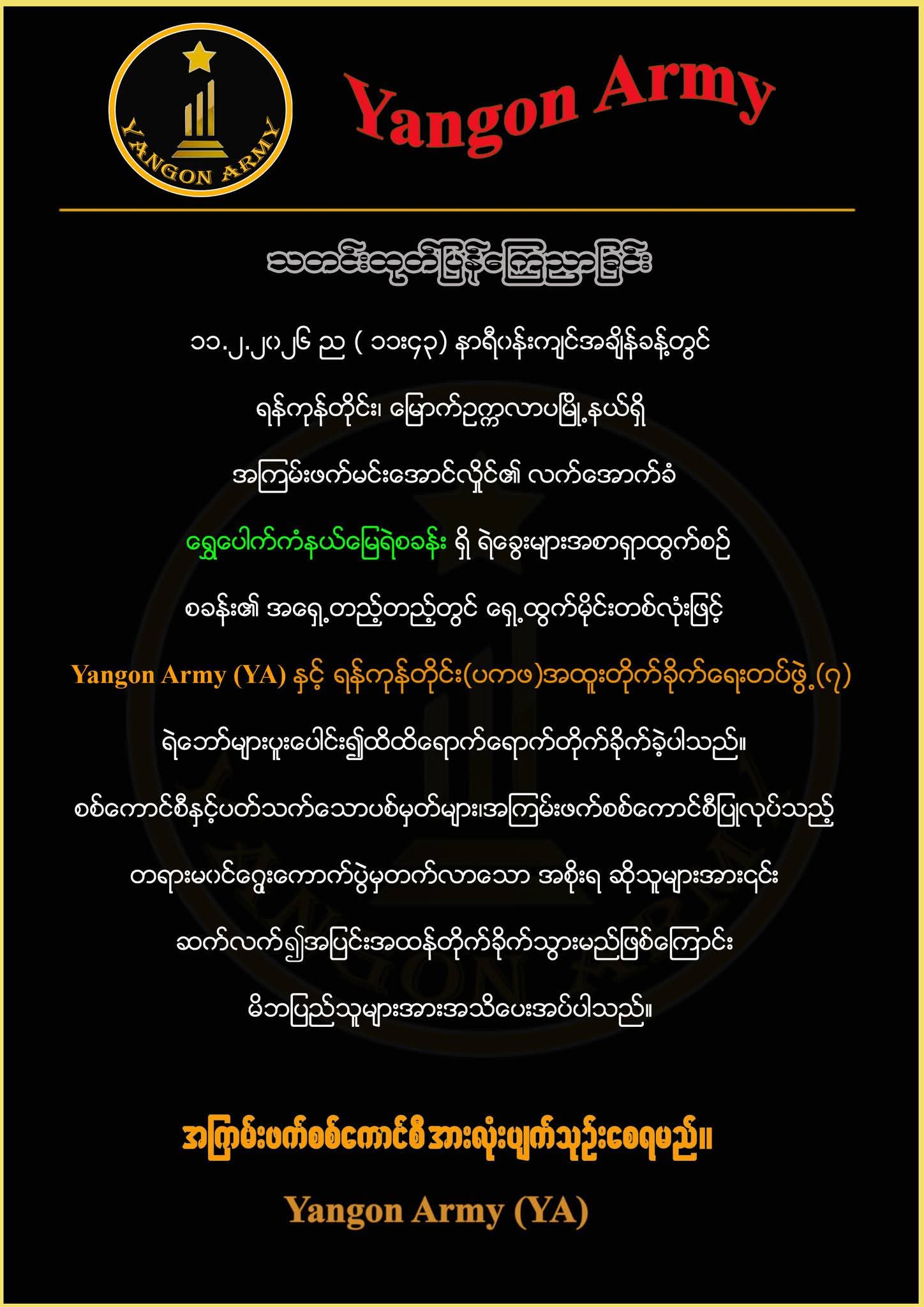 အဆိုတိုက်ခိုက်မှုကို Yangon Army (YA) နှင့် ရန်ကုန်တိုင်း (ပကဖ) အထူးတိုက်ခိုက်ရေးတပ်ဖွဲ့ (၇) ရဲဘော်များက ပူးပေါင်းလုပ်ဆောင်ခဲ့ခြင်းဖြစ်ကြောင်း၊ အကြမ်းဖက် စစ်ကောင်စီနှင့် ပတ်သက်သောပစ်မှတ်များ၊ အကြမ်းဖက် စစ်ကောင်စီပြုလုပ်သည့် တရားမ၀င်ရွေးကောက်ပွဲမှ တက်လာသော အစိုးရကိုလည်း ဆက်လက်၍ အပြင်းအထန်တိုက်ခိုက်သွားမည်ဖြစ်ကြောင်း အသိပေးပြောဆိုထားသည်။