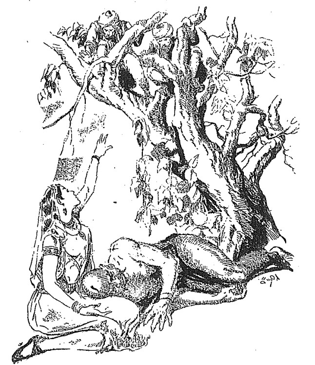 ထိုနောက် ́မယားကံဆိုးသော မင်းနှစ်ပါးသည် ခြေဦးတည့်ရာသို့ မရပ်မနား ခရီးနှင်ကြရာ ပင်လယ်ကမ်းနှင့် မနီးမဝေး ချိုအေးကြည်လင် တသွင်သွင် စီးလျက်ရှိသော ချောင်းစပ်အနီး သစ်ပင်ကြီးတစ်ပင်အောက်သို့ ဝင်ရောက်ကာ အမောဖြေ၍ နားနေကြလေသတတ်။ တစ်ပဟိုရ်ခန့် ကြာသောအခါ ပင်လယ်တွင်းမှ လှိုင်းဂယက်များ ထလျက် ဟီးဟီး ဟီးဟီး နှင့် တောင်လောက်နီးနီး မြင့်သော အရာကြီးတစ်ခု ပေါ်လာသည်ကို တွေ့ကြလေသတတ်။ ထိုမြင့်မား မည်းမှောင်သော အရာကြီးသည် မိမိတို့ ရှိရာသို့ ရှေးရှု၍ လာနေသည်ကို တွေ့ကြရသောအခါ အဘယ် အခြင်းအရာ ဖြစ်သည်ကို မသိကြသဖြင့် ထိတ်လန့်သောအားဖြင့် သစ်ပင်ထက်သို့ တက်၍ ပြေးကြလေသတတ်။