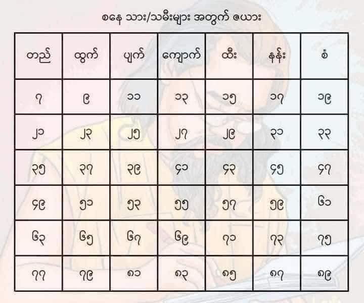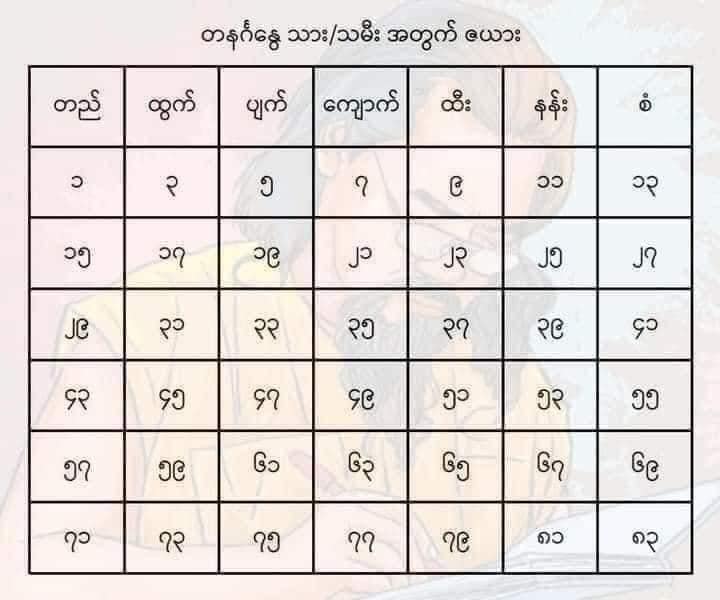 • မိမိက တနင်္ဂနွေသားသမီး၊ အခုရောက်သက် (၂၅) နှစ် ဆိုရင် တနင်္ဂနွေဇယားကွက်ထဲမှာ (၂၅) ကို ရှာပါ။ “နန်း” အကွက်ထဲမှာ ရှိနေရင် အောက်က “နန်း” အဟောကို ဖတ်ပါ။
