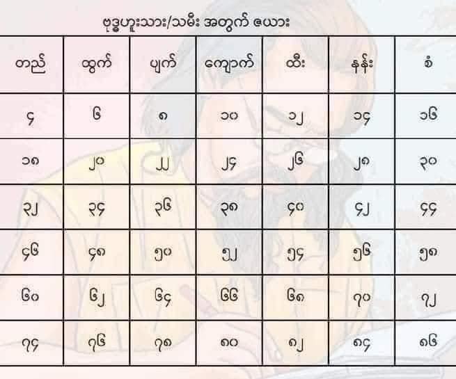 • မိမိက တနင်္လာသားသမီး၊ အခုရောက်သက် (၂၀) နှစ် ဆိုရင် တနင်္လာဇယားကွက်ထဲမှာ (၂၀) ကို ရှာပါ။ “ပျက်” အကွက်ထဲမှာ ရှိနေရင် အောက်က “ပျက်” အဟောကို ဖတ်ပါ။