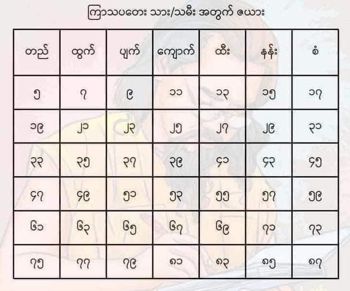 (အောက်ပါ ဇယားပုံတွင် တိုက်ဆိုင်စစ်ဆေးပါ)
