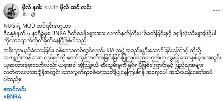 ယနေ့ ဖေဖော်ဝါရီလ ၁၇ ရက်၊ နံနက် ၇ နာရီခွဲအချိန်ခန့်မှ စတင်ကာ အမျိုးသားညီညွတ်ရေးအစိုးရ (NUG)၊ ကာကွယ်ရေးဝန်ကြီးဌာန (MOD) လက်အောက်ခံ တပ်ရင်းများက ဗမာ့အမျိုးသားတော်လှန်ရေးတပ်မတော် (BNRA) ၏ ဂိတ်စခန်းများကို လက်နက်ကြီးများဖြင့် ပစ်ခတ်ခြင်းနှင့် ဒရုန်းဗုံးသီးများ အသုံးပြု၍ တိုက်ခိုက်ခြင်းများ ပြုလုပ်လာကြောင်း ယင်းအဖွဲ့ ခေါင်းဆောင် ဗိုလ်နဂါးက ၎င်း၏ လူမှုကွန်ရက် စာမျက်နှာ၌ ရေးသားထားသည်။