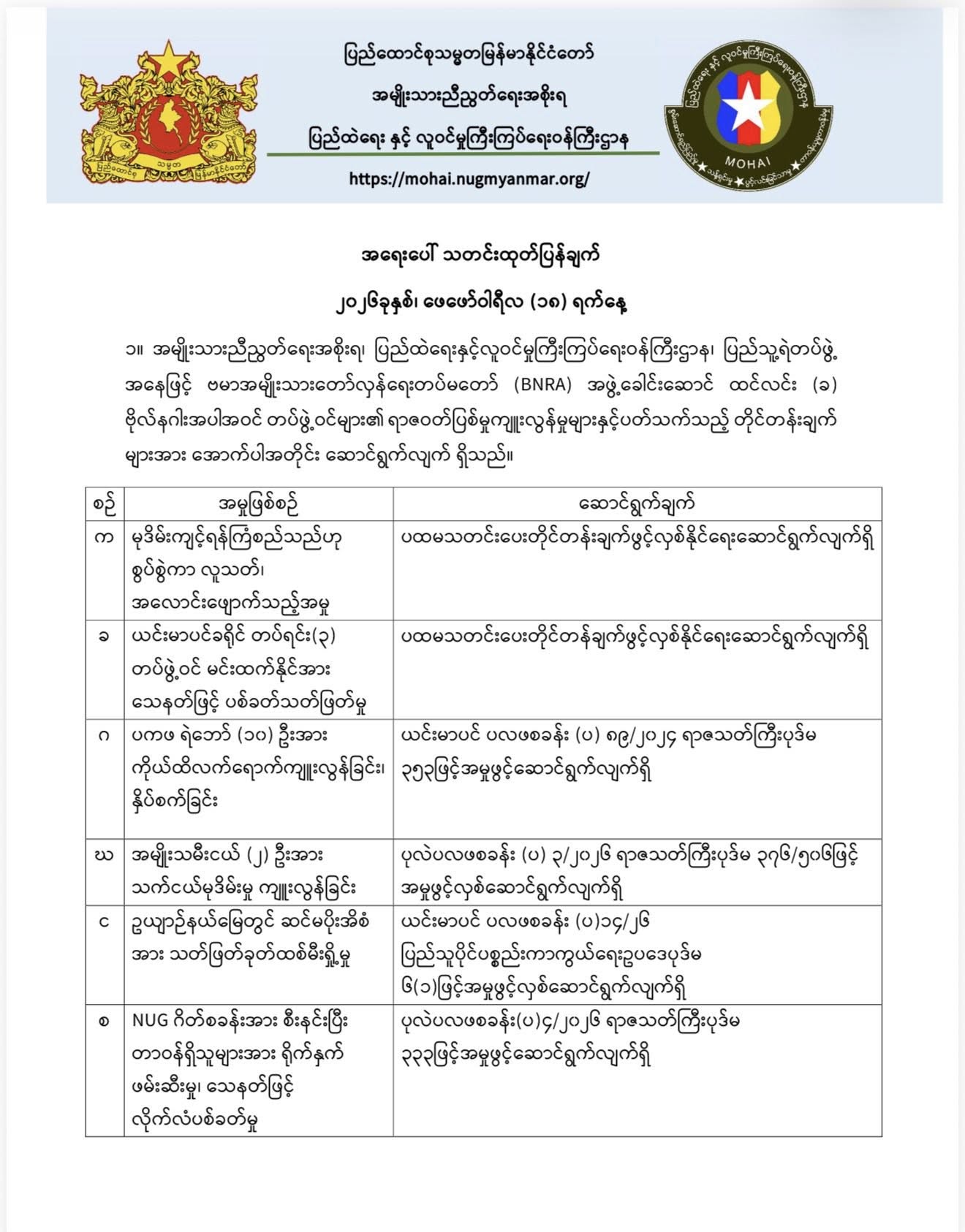 BNRA အဖွဲ့ခေါင်းဆောင် ထင်လင်း(ခ)ဗိုလ်နဂါး ကျုးလွန်ထားသည့်အမှုများနှင့်ပတ်သက်ပြီး အရေးယူဆောင်ရွက်ထားမှု အခြေအနေများအား အမျိုးသားညီညွတ်ရေးအစိုးရ၊ ပြည်ထဲရေးနှင့်လူဝင်မှုကြီးကြပ်ရေးဝန်ကြီးဌာန၏ ယနေ့ထုတ်ပြန်ချက်။