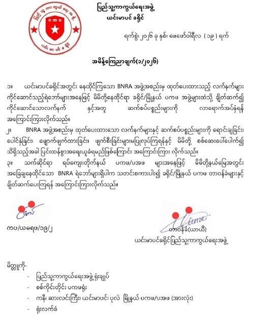 ထို့အပြင် ယင်းမာပင်ခရိုင်၊ ပြည်သူ့ကာကွယ်ရေးအဖွဲ့ (ပကဖ) ကလည်း BNRA အဖွဲ့က ထုတ်ပေးတဲ့ လက်နက် ကိုင်ဆောင်ထားသူတွေ အနေဖြင့် မိမိတို့ရဲ့ ခရိုင်/မြို့နယ် ပ.က.ဖ အဖွဲ့တွေထံ လက်နက်နဲ့ ဆက်စပ်ပစ္စည်းများကို လာရောက်အပ်နှံကြဖို့ အမိန့်ကြေညာချက်တစ်စောင် ထုတ်ပြန်ခဲ့ပါတယ်။
