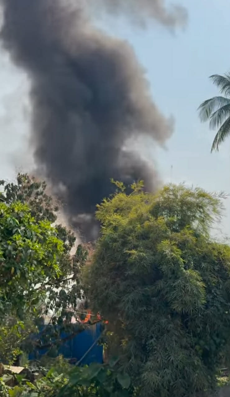 (SKY Villa ကွန်ဒို ကားအဟောင်းတွေ စုပြုံထားတဲ့နေရာ မီးလောင်ကျွမ်းနေစဥ်။ ဓာတ်ပုံ – နေ့သစ်)