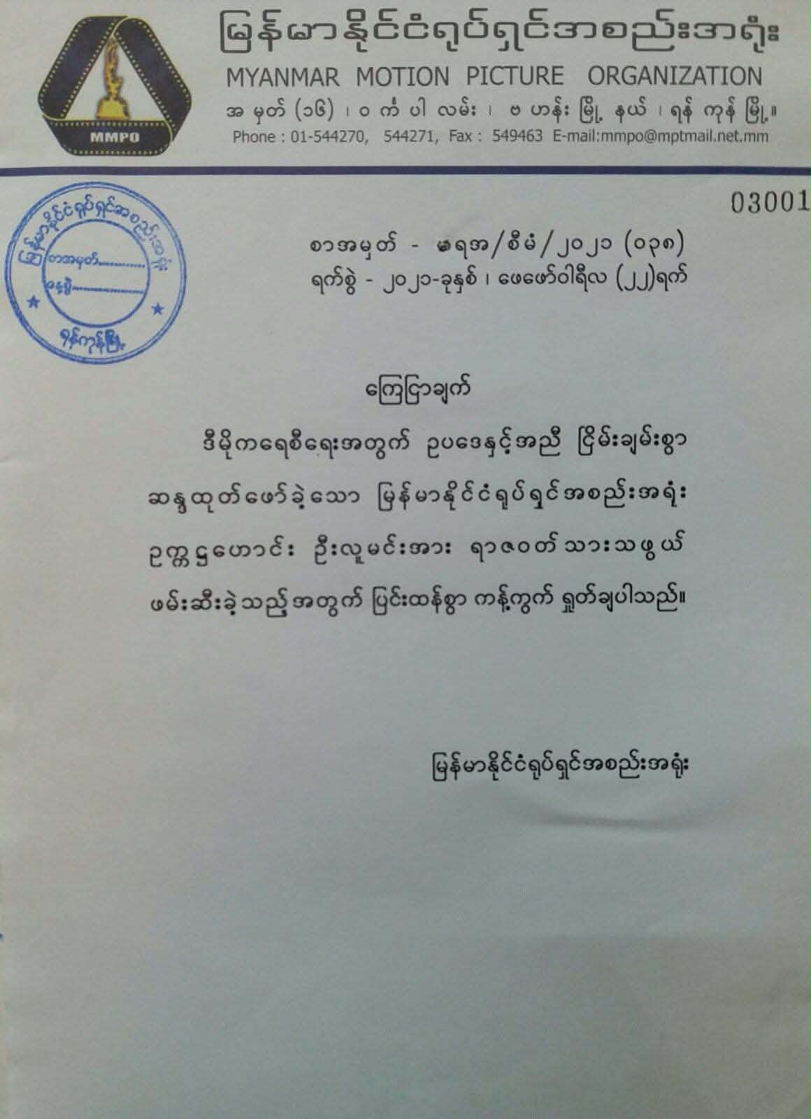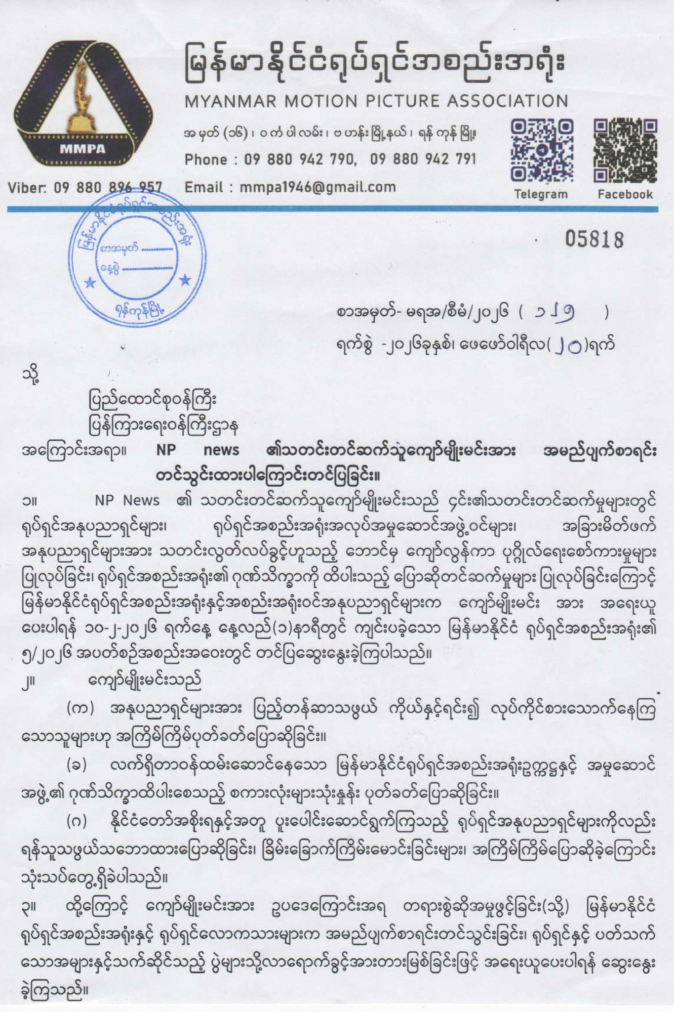 ရုပ်ရှင်အနုပညာနှင့်ဆိုင်သောပွဲများ အခမ်းအနား များသို့ ၎င်းပုဂ္ဂိုလ်အား ဖိတ်ကြားမည်ဆိုပါက ၎င်းကြောင့် စိတ်နှလုံးမချမ်းမသာ ဖြစ်ကြရသည့် မြန်မာနိုင်ငံရုပ်ရှင်အစည်းအရုံးနှင့် ရုပ်ရှင်အနုပညာရှင်များကို ဖိတ်ကြားခြင်းမပြုပါရန် အသိပေး မေတ္တာရပ်ခံရန် ဆုံးဖြတ်ကြကြောင်း၊ မြန်မာနိုင်ငံရုပ်ရှင် အစည်းအရုံးနှင့် ရုပ်ရှင်အနုပညာရှင်များသည် သတင်းလွတ်လပ်ခွင့်ကို လေးစားပါကြောင်း၊ သို့သော်သတင်းလွတ်လပ်ခွင့်သည် အခြားသူတစ်ဦးအား ပရမ်းပတာစော်ကားခွင့်ပြုခြင်းမဟုတ်ဟု ယူဆကြောင်း၊ ထို့ကြောင့် မြန်မာနိုင်ငံရုပ်ရှင်အစည်းအရုံးသည် NP News မှ သတင်းတင်ဆက်သူ ကျော်မျိုးမင်းအား မြန်မာနိုင်ငံရုပ်ရှင်အစည်းအရုံးနှင့် ရုပ်ရှင်အနုပညာရှင်များ၏ မိတ်ဖက် အဖြစ်မှ ပယ်ဖျက်ကာ အမည်ပျက်စာရင်းတင်သွင်းထားကြောင်း လေးစားစွာ အသိပေးတင်ပြကြောင်း မြန်မာနိုင်ငံရုပ်ရှင် အစည်းအရုံး၏ ပေးပို့စာတွင် တွေ့ရှိရသည်။