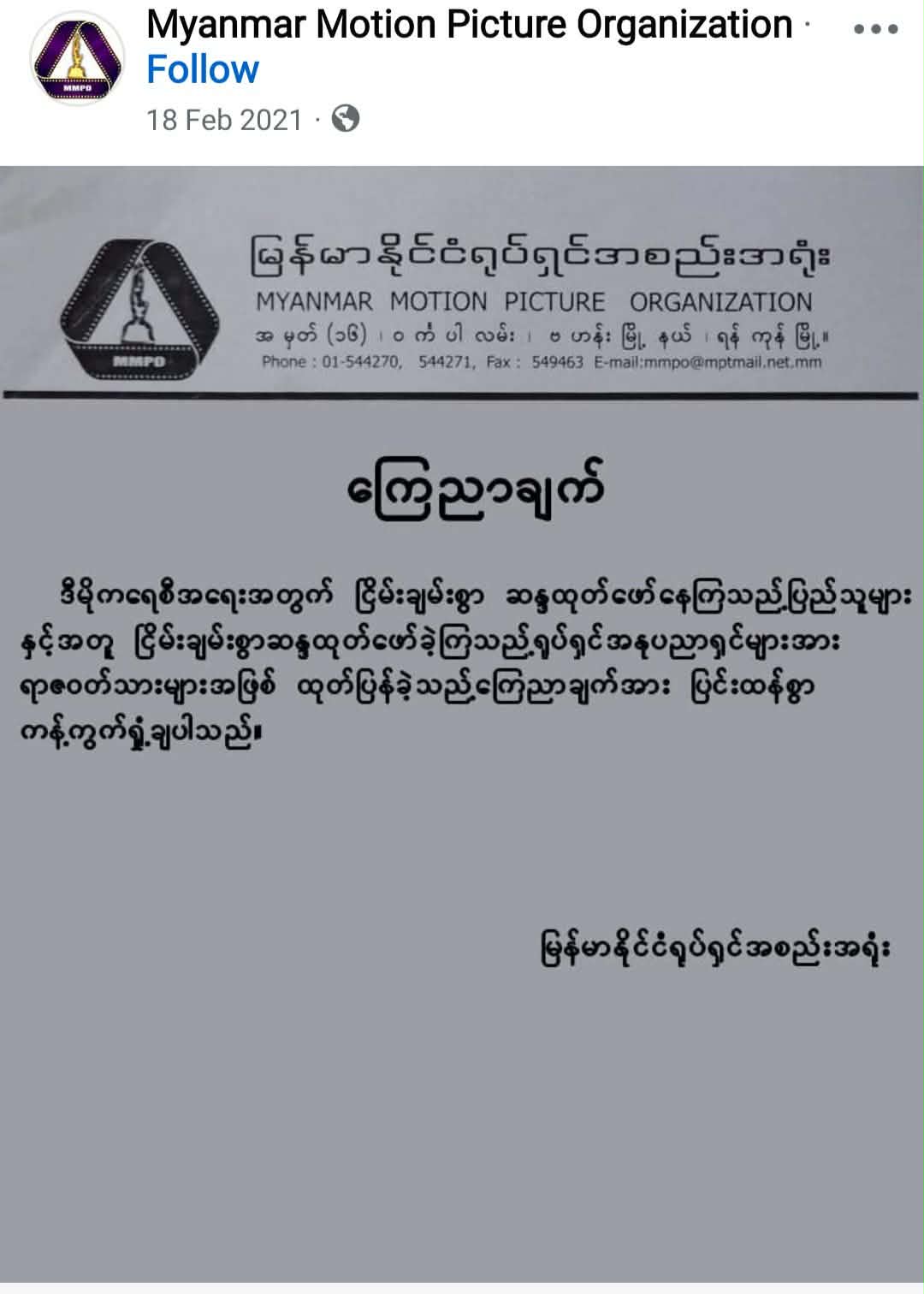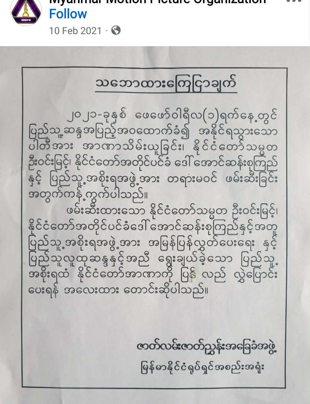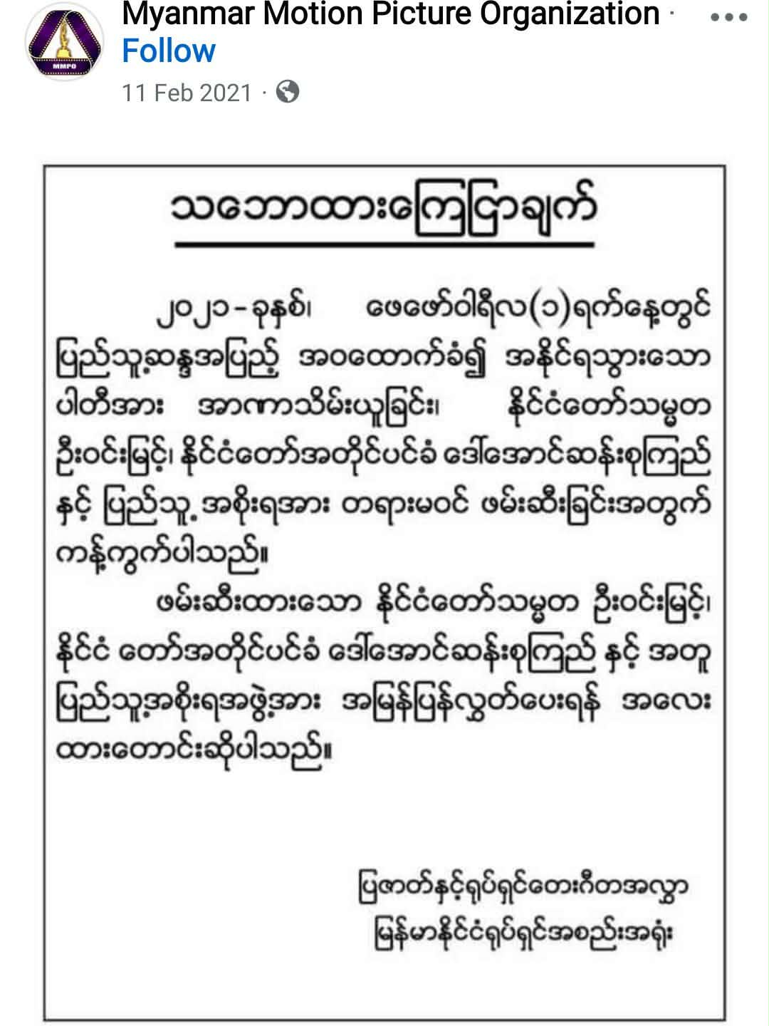” ရုပ်ရှင်အစည်းအရုံးက အခုလို သတင်းရယူခွင့် ပိတ်ပင်တာ၊အမည်ပျက်စာရင်း တင်သွင်းတယ်ဆိုတာဟာ လွန်ခဲ့တဲ့ ၂၅ နှစ်၊ နှစ် ၃၀ က Yellow Journalism သမားတွေက ငါနဲ့ မတည့်တဲ့သူ သတင်းမယူရဆိုတဲ့ ခေတ်ကို ပြန်သွားသလို ဖြစ်နေတယ်။ မသင့်လျာ်ပါဘူး။ အခု NP News က ကိုကျော်မျိုးမင်းပြောနေတဲ့အကြောင်းအရင်းတွေလည်း ရှိတယ်။ CDM ကို ၇ ရက် တောင့်ခံထားရင် ဖြစ်ပြီ။ ပြည်သူတွေက တစ်သက်လုံး ထမင်းတင်ကျွေးထားမယ်ဆိုပြီး အနုပညာရှင်၊မင်းသား၊ မင်းသမီးတွေ၊ ရုပ်ရှင်လောကလူတွေ အုံနဲ့ကျင်းနဲ့ အကြီးအကျယ် ဝါဒဖြန့်လှုံ့ဆော်ခဲ့ကြတယ်။ ဒီလိုလှုံ့ဆော်ခဲ့ကြတာတွေရဲ့ နောက်ဆက်တွဲမှာ လူပေါင်းများစွာ အသက်ဆုံးရှုံးခဲ့ရတာ။ ဘဝပေါင်းများစွာ ပျက်စီးခဲ့ရတာတွေလည်း ရှိတယ်။ အဲဒီလိုဖြစ်ခဲ့တဲ့ဟာ တွေအတွက် မကျေနပ်တာတွေကလည်း တစ်ဖက်မှာရှိတယ်။ ဘာပဲဖြစ်ဖြစ် ဒီလို လူတွေရဲ့ ဘဝပျက်စီးစေခဲ့သူတွေက နိုင်ငံတော်အဆင့် ပုဂ္ဂိုလ်တွေအဖြစ် ချီးမြှောက်ခံရ၊ တစ်ဖက်မှာ ဟိုလူတွေက ဘဝပျက် ပြီး စားစရာမဲ့သောက်စရာမဲ့ဘဝပျက်ကြရ။ မိသားစုတွေ ဆုံးရှုံးရ၊ ဒီလိုတွေ ရှိခဲ့တဲ့အခြေအနေမှာ ဒါတွေလုပ်ခဲ့ကြတဲ့သူတွေ က အထက်စီးဆန်မယ်။ အနိုင်ကျင့်မယ် ဆိုတာမျိုးတော့ မဖြစ်သင့်ပါဘူး။ နီပေါတွေများတဲ့ ဒီအဝန်းအဝိုင်းမှာ Hypocrite ကြောင်သူတော်ဝါဒ တွင်ကျယ်သလို ဖြစ်တယ်။ ဒါ့အပြင် အခုကိစ္စက ဥပဒေကျော်လွန်လုပ်လို့မရဘူး။ ဖွဲ့စည်းပုံအခြေခံဥပဒေအရ သတင်းမီဒီယာကောင်စီရှိတယ်။ သတင်းမီဒီယာ ဥပဒေလည်းရှိ ပြီးသား။ လွတ်လပ်စွာ သတင်းသိပိုင်ခွင့်နဲ့ သတင်းရယူခွင့်ကိုတားဆီးပိတ်ပင်လို့ မရဘူး။ ဒီလိုလုပ်တာဟာ ဥပဒေကို မလေးစားရာရောက်တယ်။ ဥပမာ သတင်းသမားရဲ့ အရေးအသား တင်ဆက်မှုအပေါ် မကျေနပ်ရင် တိုင်ကြားလို့ ရတယ်။ သတင်းမယူရဆိုပြီး ပိတ်ပင်ပိုင်ခွင့် တော့မရှိဘူး။ အခုလိုမျိုးရုပ်ရှင်အစည်းအရုံးရဲ့လုပ်ရပ်က ဥပဒေကို ကျော်လွန်နေတယ်။ အချက်အလက်အားဖြင့် သူ (ကိုကျော်မျိုးမင်း) ပြောတာမှာ ဘာမှားသလဲ၊ ရုပ်ရှင်အစည်းအရုံးက မှန်ရင် တရားဝင်ရှင်းလို့ရတယ်။ မမှန်ကန်ဘူးဆိုရင်လည်း ဥပဒေအတိုင်း သွားလို့ရတယ်။ ဒီလိုမဟုတ်ဘဲ သတင်းရယူခွင့် ပိတ်ပင်သလိုလုပ်တာတို့၊ အခုလိုအမည်ပျက်စာရင်းသွင်းတယ်ဆုတာမျိုးက မဖြစ်သင့်ဘူး။ အာဏာထိန်းပြီး ငါးနှစ်အတွင်းမှာ နိုင်ငံရေး၊ စီးပွားရေး၊ လူမှုရေးသတင်းအများအပြားက နိုင်ငံရေးအခြေအနေ၊ လုံခြုံရေး အခြေအနေကြောင့် ရေးသားလို့ ဖော်ပြလို့ မလွယ်ဘူး။ အဲဒီအချိန်မှာ Yellow Journalism သတင်းတွေကပဲ မင်းမူနေတယ်။ ဒီသတင်းတွေ ဒီလို ကဏ္ဍတွေမှာ ကြော်ငြာတွေက အကုန်ရောက်နေတယ်။ ဒါပေမယ့် အခုမကြာမီခေတ်က ပြောင်းလာတော့မယ်။ လွှတ်တော်ပေါ်လာတော့မယ်။သတင်းတွေက တခြားဘက်တွေမှာ အာရုံစိုက်စရာ ပိုများလာတ
