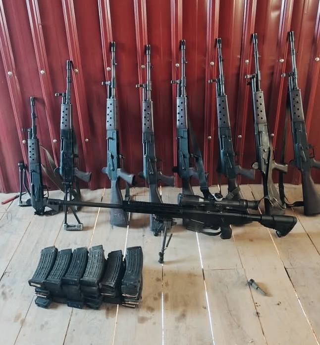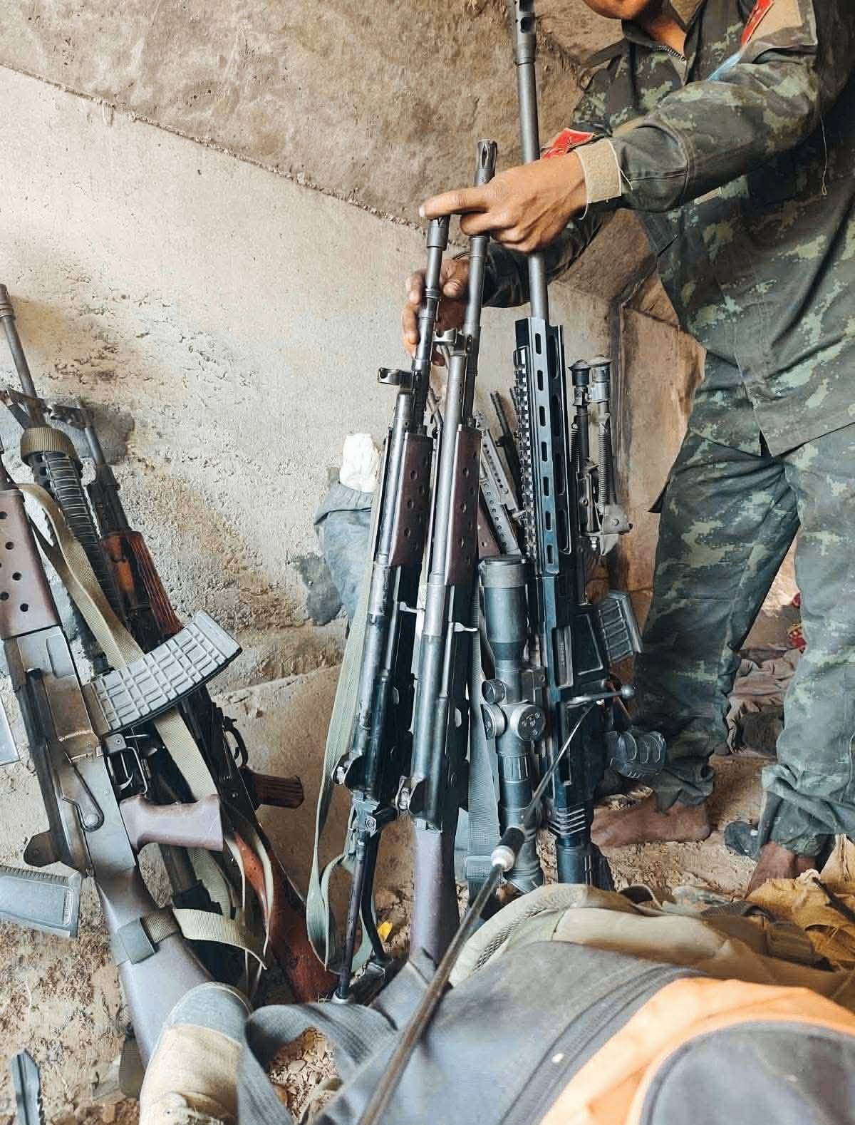 (ချင်းပြည်နယ်၊ ဖလမ်းမြို့နယ် ထင်းရှူးစခန်းမှာ တပ်စွဲထားတဲ့ စစ်ကောင်စီတပ် တိုက်ခိုက်မှုအတွင်း သိမ်းရတဲ့ လက်နက်ခဲယမ်းတွေ။ ဓာတ်ပုံ − Chinland News)