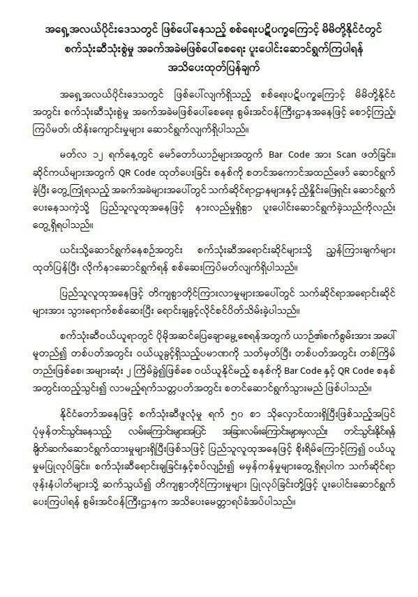 တစ်ပတ်အတွင်း ဝယ်ယူခွင့်ရှိသည့်ပမာဏကို သတ်မှတ်ပြီး Bar Code နှင့် QR Code စနစ်အတွင်း ထည့်သွင်း၍ လာမည့်ရက်သတ္တပတ်အတွင်း စတင်ဆောင်ရွက်မည်