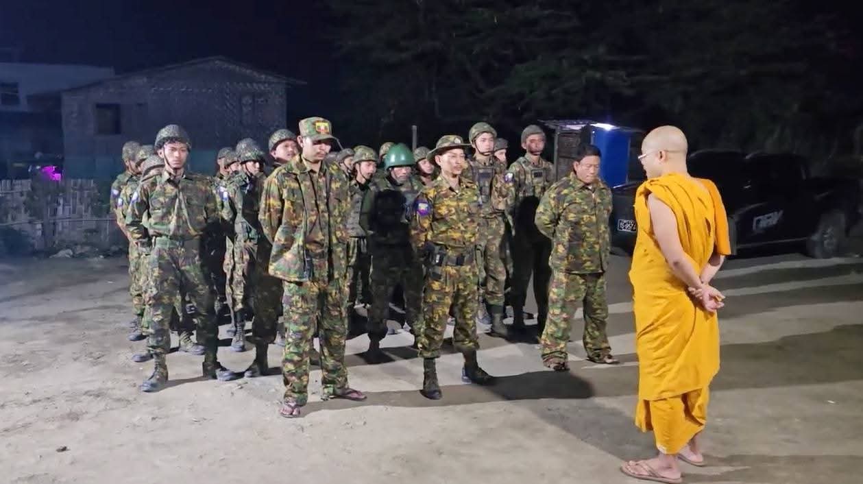 (မန္တလေးမြို့မှ တွေ့ရတဲစစ်သားတွေ/ ပျူဘုန်းကြီးသင်္ကန်းဝတ်ပေါက်ကိုယ်တော်နဲ့ ပျူစောထီးတွေ/ ပြည်ကြီးတံခွန်မြို့နယ်က ပျူခေါင်းဆောင်စံရှား ။ဓါတ်ပုံ-CJ ၊စစ်ကောင်စီ)