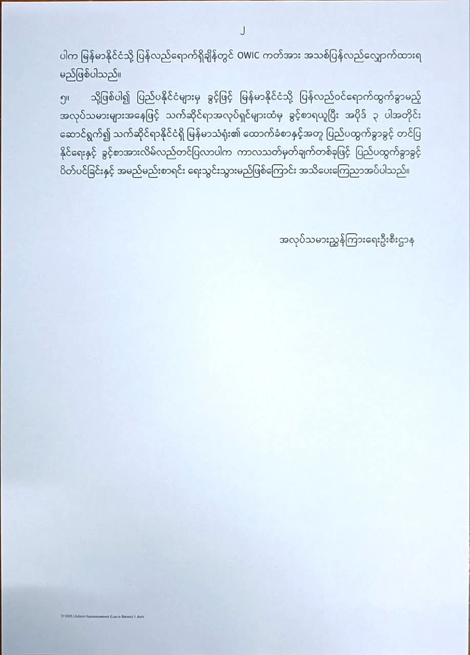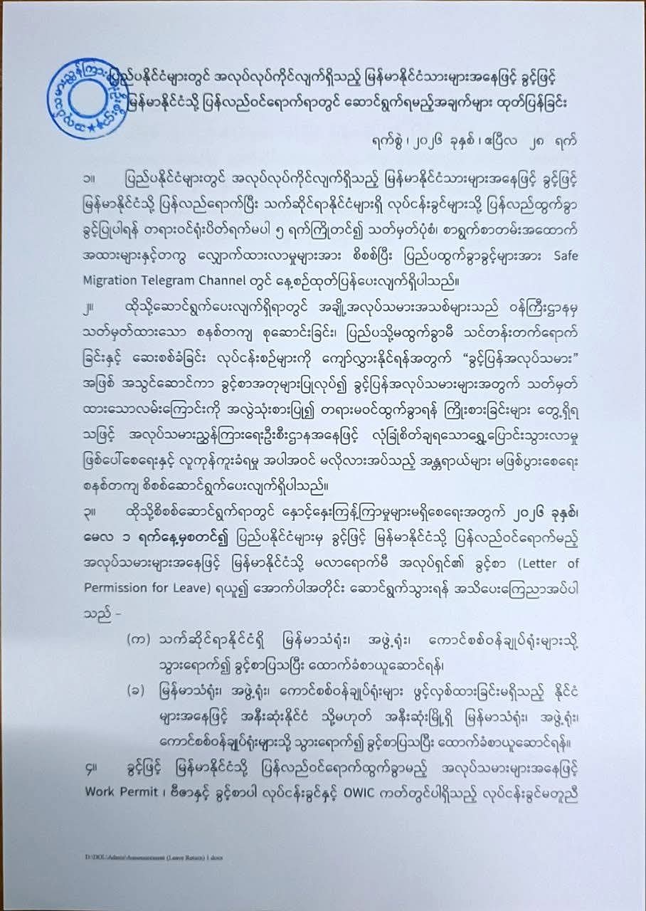 ပြည်ပရောက် မြန်မာအလုပ်သမားများ မြန်မာနိုင်ငံသို့ ခွင့်ဖြင့် ပြန်လာမည်ဆိုပါက သက်ဆိုင်ရာ မြန်မာသံရုံး ထောက်ခံစာ ယူဆောင်လာရမည်ဖြစ်ပြီး ညွှန်ကြားချက် မလိုက်နာလျှင် ပြည်ပထွက်ခွာခွင့်ပိတ်ကာ အမည်ပျက်စာရင်းသွင်းမည်ဟု အမိန့် ထုတ်