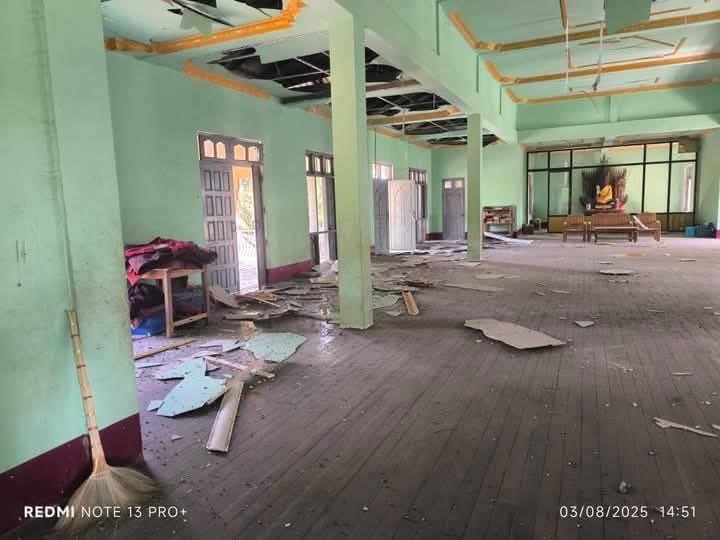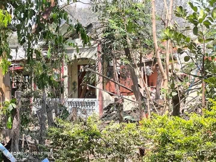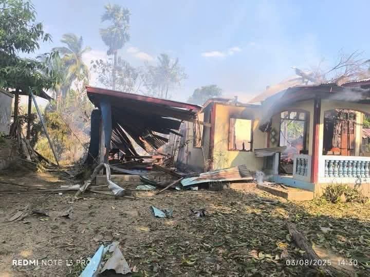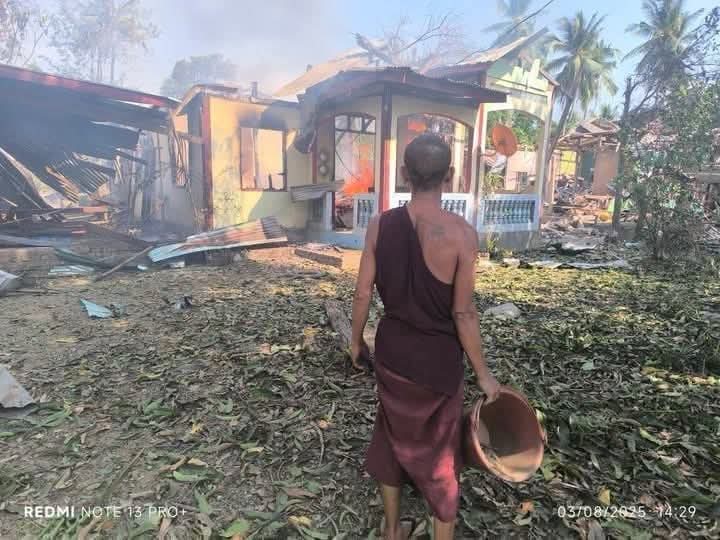 ပုံအညွှန်း- ထန်းတပင်မြို့နယ်၊ ကျောက်ကြီးပေါက်ရွာ အပါအဝင် အနီးအနားကျေးရွာများကို စစ်ကောင်စီက မတ်လ ၆ ရက်နေ့မှစ၍ မတ်လ ၈ ရက်အထိ လေကြောင်းမှ ဗုံးကြဲတိုက်ခိုက်မှုများ ပြုလုပ်ခဲ့သဖြင့် ဒေသခံ လေးဦးသေဆုံးပြီး ခုနစ်ဦးထက်မနည်း ထိခိုက်ဒဏ်ရာရကာ ဘုန်းကြီးကျောင်း၊ ဒေသခံနေအိမ် ၁၀ လုံးထက်မနည်း ထိခိုက်ပျက်စီးခြင်းရှိသည်။ (ဓါတ်ပုံ-CJ)