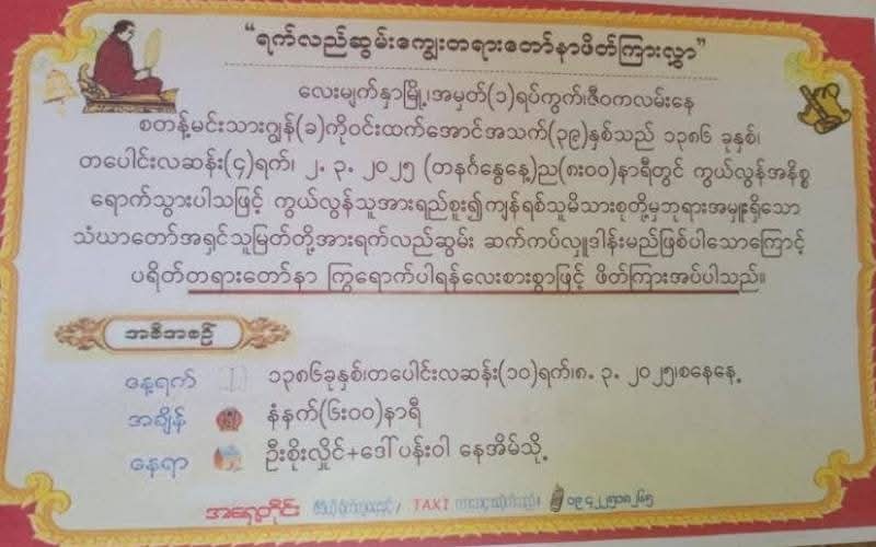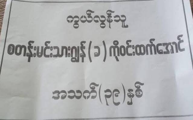 ပုံအညွှန်း- စစ်ကောင်စီ ရဲနှစ်ဦးဖမ်းဆီးပြီးနောက် သေနတ်ဖြင့် ပစ်သတ်ခံလိုက်ရသည့် စတန့်မင်းသား ဂျွန် ၏ ဓာတ်ပုံနှင့် နာရေးဖိတ်စာ၊ စတန့်မင်းသားဂျွန်သည် မတ်လ ၂ ရက်ညနေ ၆ နာရီခွဲ အချိန်က ဖမ်းဆီးခံခဲ့ရပြီးနောက် နှစ်နာရီအကြာ ညနေ ၈ နာရီခွဲတွင် ၎င်းသေဆုံးကြောင်း မိသားစုထံ အကြောင်းကြားခဲ့သည်။ (ဓာတ်ပုံ – ပေးပို့)