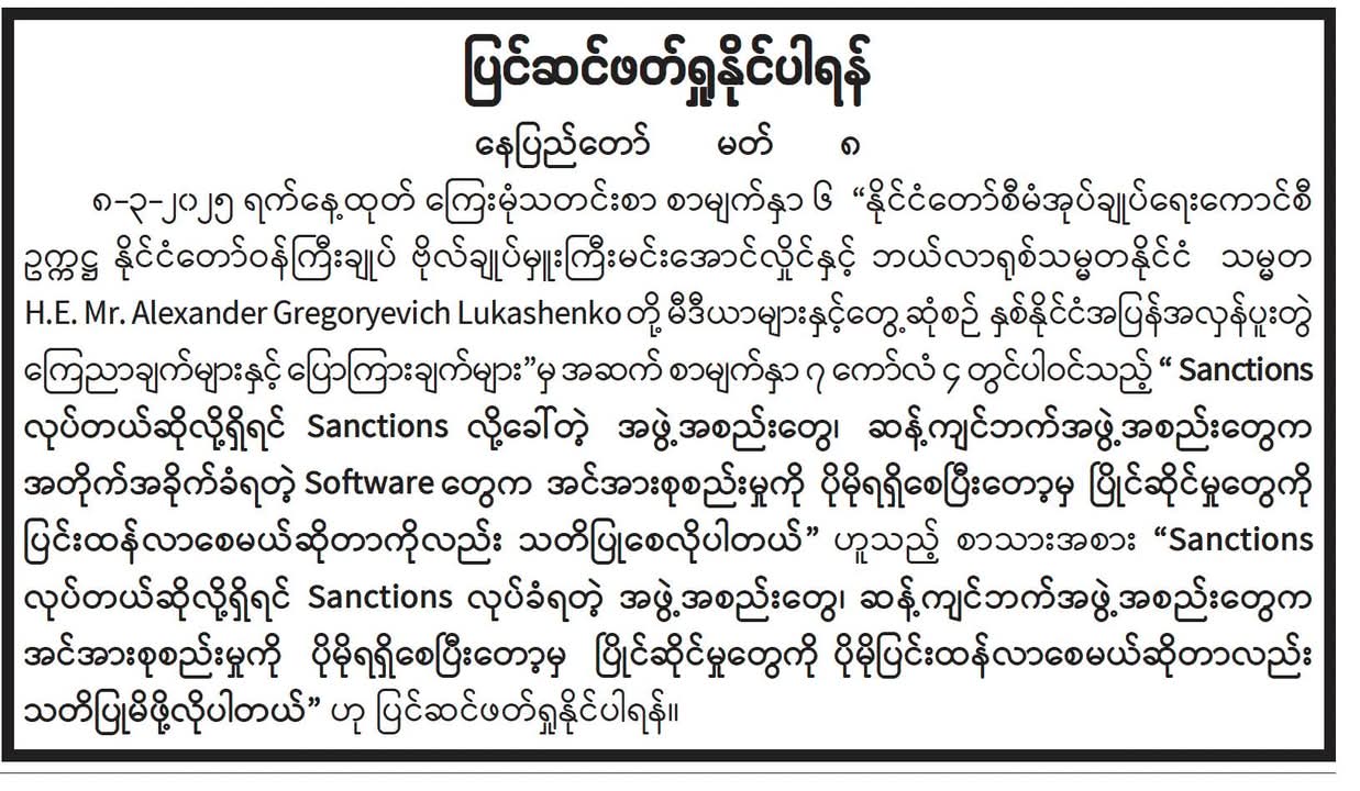 စစ်ခေါင်းဆောင် ဗိုလ်ချုပ်မှူးကြီး မင်းအောင်လှိုင်သည် ဘီလာရုစ်သမ္မတလူကာရှန်နှင့် တွေ့ဆုံပြီး မီဒီယာများအားရှင်းလင်းစဉ် စီးပွားရေးပိတ်ဆို့အရေးယူမှုအကြောင်းပြောရာ၌ “ဆော့ဝဲလ်” စကားလုံးကို အဆက်စပ်မရှိ ထည့်သွင်းပြောဆိုသဖြင့် ဝေဖန်မှုများရှိလာပြီးနောက် စစ်ကောင်စီသတင်းစာများ၌ အမှားပြင်ဆင်ချက် ပြန်လည်ထည့်သွင်းခဲ့သည်။
