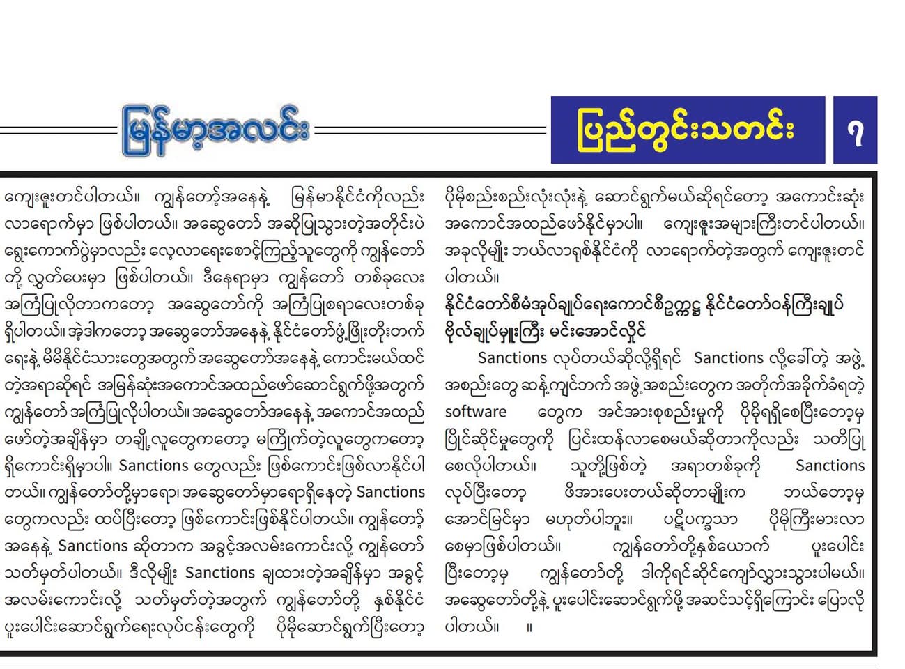 ထိုဖော်ပြချက်နှင့်ပတ်သက်၍ “Software” ဆိုသည့် စကားလုံးကို ချန်လှပ်၍ ပြင်ဆင်ဖတ်ရှုရန် ယနေ့ထုတ် စစ်ကောင်စီ သတင်းစာများ၌ အမှားပြင်ဆင်ချက် ပြန်လည် ထည့်သွင်းခဲ့ခြင်းဖြစ်သည်။
