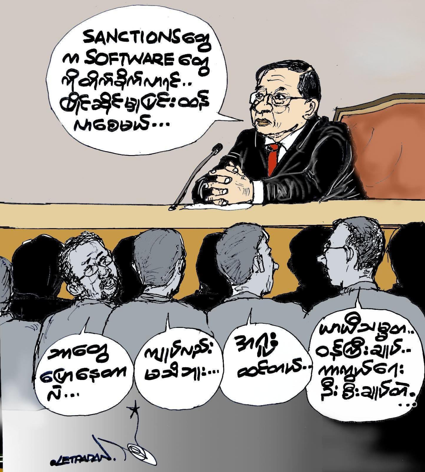 မင်းအောင်လှိုင်က Sanctions စီးပွားရေးပိတ်ဆို့မှုနှင့် ကွန်ပျူတာဆော့ဝဲ Software ၏ ကွဲပြားခြားနားသော အဓိပ္ပာယ်နှင့် အင်္ဂလိပ်စာ အသုံးအနှုန်းကို နားမလည်ဘဲ ထင်ရာမြင်ရာ ပြောဆိုရာမှ မှားယွင်းသွားခဲ့ခြင်းဖြစ်ကြောင်း သတင်းရင်းမြစ်ကဆိုသည်။
